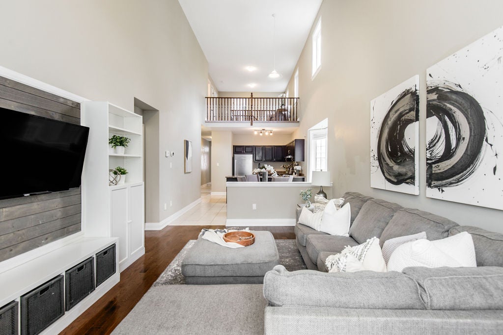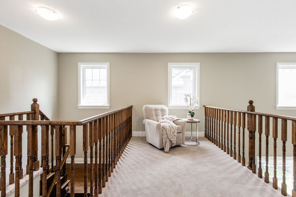 access to the garage. Upstairs, a cozy media loft overlooks the family room and showcases a beautifully crafted oak staircase, adding warmth