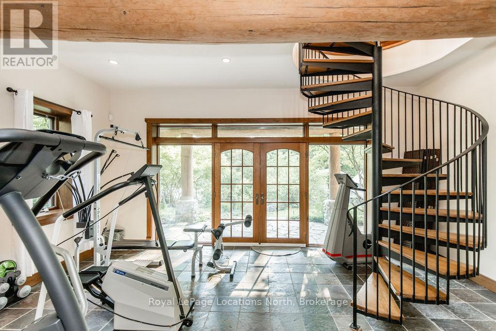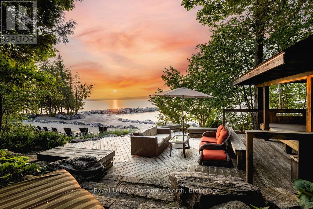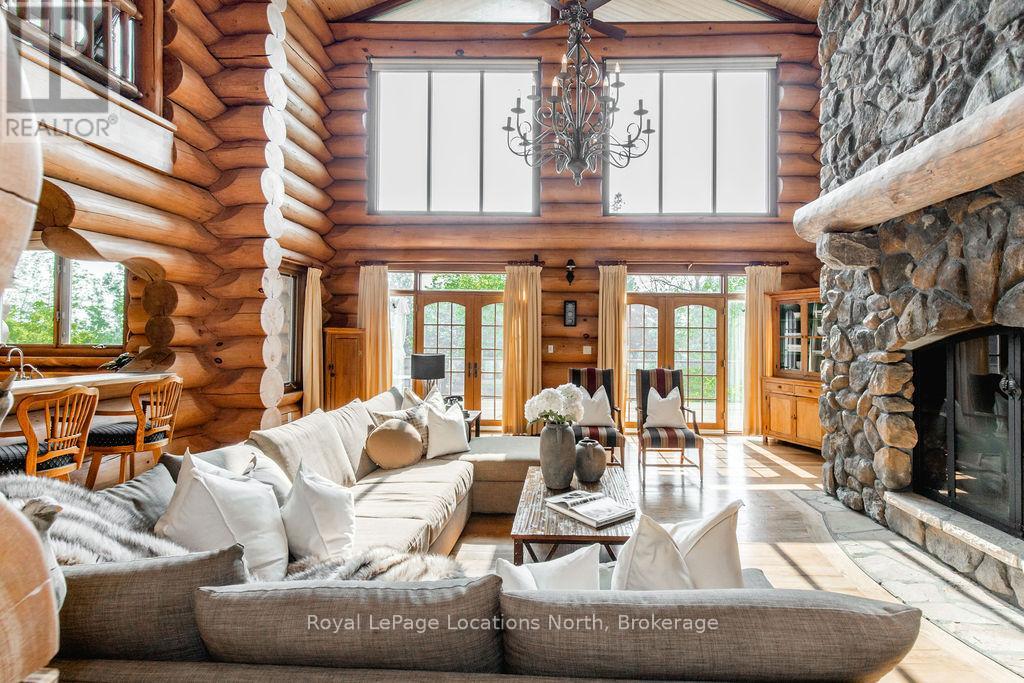 Welcome to one of Canada's largest log mansions, a Yellowstone of the North that rivals the magnificent log building in the Yellowstone TV series.This breathtaking, one-of-a-kind waterfront estate at the very point of Georgian Bay's Cedar Point redefines luxury living.Built in 2002 as a private resort, set on 4.37 acres of landscaped grounds w/ 2 beaches over 412 ft of pristine shoreline.With close to 14,000sqft, every detail of this custom-designed home was lavished w/uncompromising quality.The main residence features 8 bed+8 bath+ 2nd living quarters-2 bed+2 bath.Every room is a statement w/soaring ceilings, rich finishes + breathtaking views. Outdoors,this waterfront sanctuary captivates w/private sandy beach, cabana, gentle streams+ 90-ft stone pier offering panoramic views.Boaters will value an 80-ft seasonal dock at the 2nd, pebble beach. Birders will be impressed to learn that Cornell Lab identified 100+species.At night, gather at the pier under a canopy of stars/luxuriate in the 8-person in-ground hot tub.A true legacy property, offering a level of privacy, scale + beauty that simply can't be replicated.Massive log doors feature hand-carved artwork & open to 20-ft high grand foyer a Shooting-the-Rapids carving.Main floor- dining room, living room w/wet bar, sitting room w/ beautiful lake views+office.Custom Kitchen offers a Dacor + Thermador stoves, oven, Sub-Zero fridge/wine cooler, butlers pantry,2 dishwashers+fireplace.The spectacular main floor primary suite has vaulted ceilings, stone f/p +spa-like ensuite w/private deck.Upstairs:3 bed+3 bath + family room.The w/out lower level includes a new accessible bedroom w/ensuite, laundry, games room, gym+Sonos-equipped home theatre.20-seat English pub offers-draft taps/Sub-Zero cooler/keg fridge,ice maker+custom stone fireplace.In-flr heat throughout main home/garage/guesthouse.4-car heated garage. New boiler, cedar shingled roof, irrigation, Starlink internet/cell tower, cobblestone driveway, 90-ft stone pier. (id:4069)