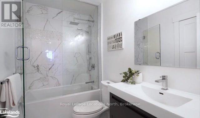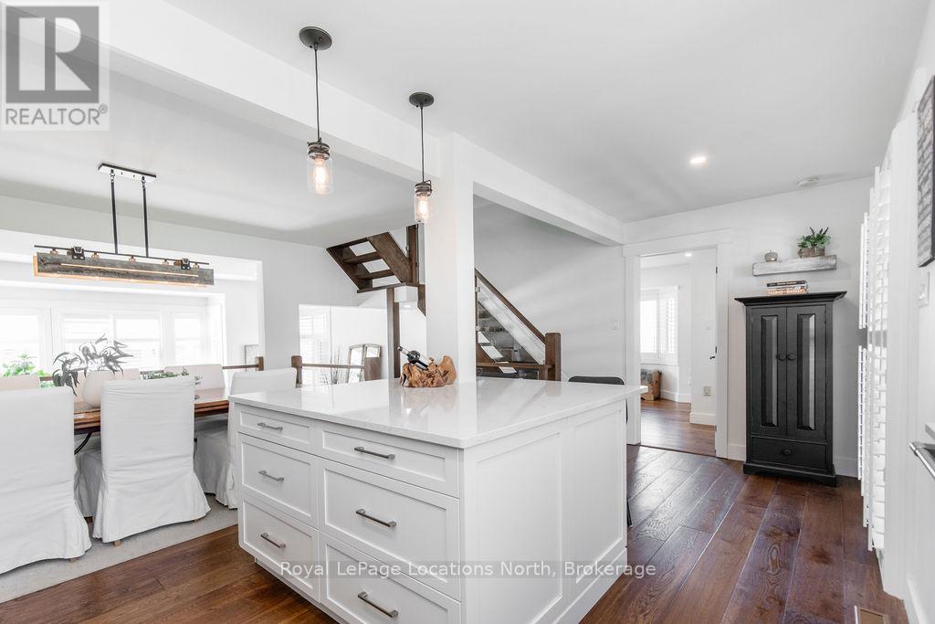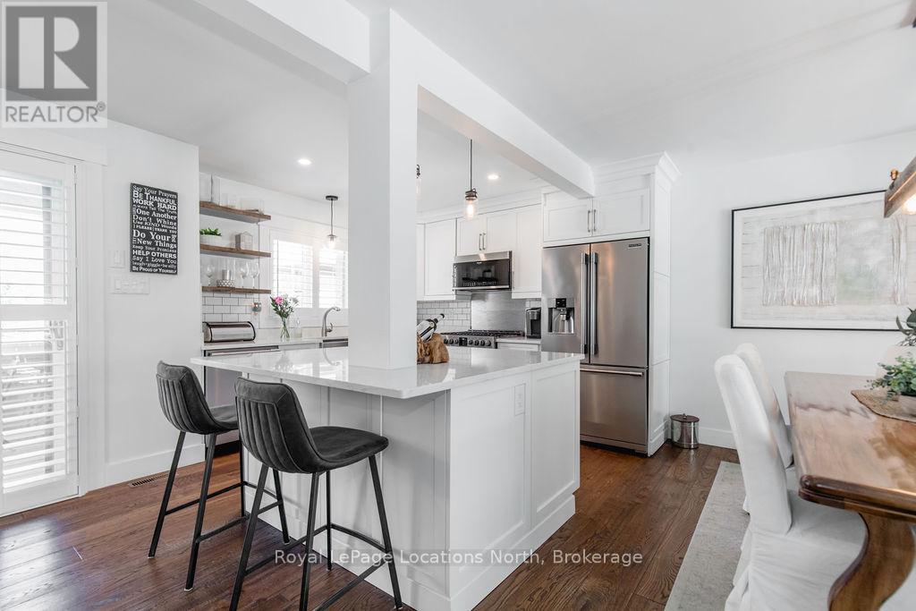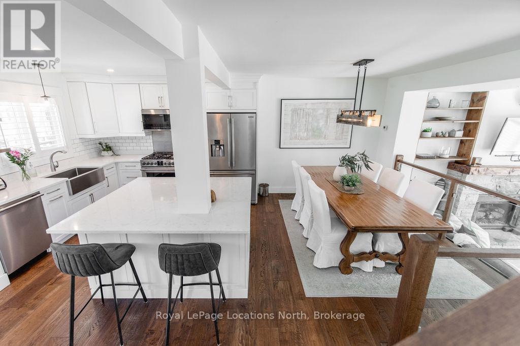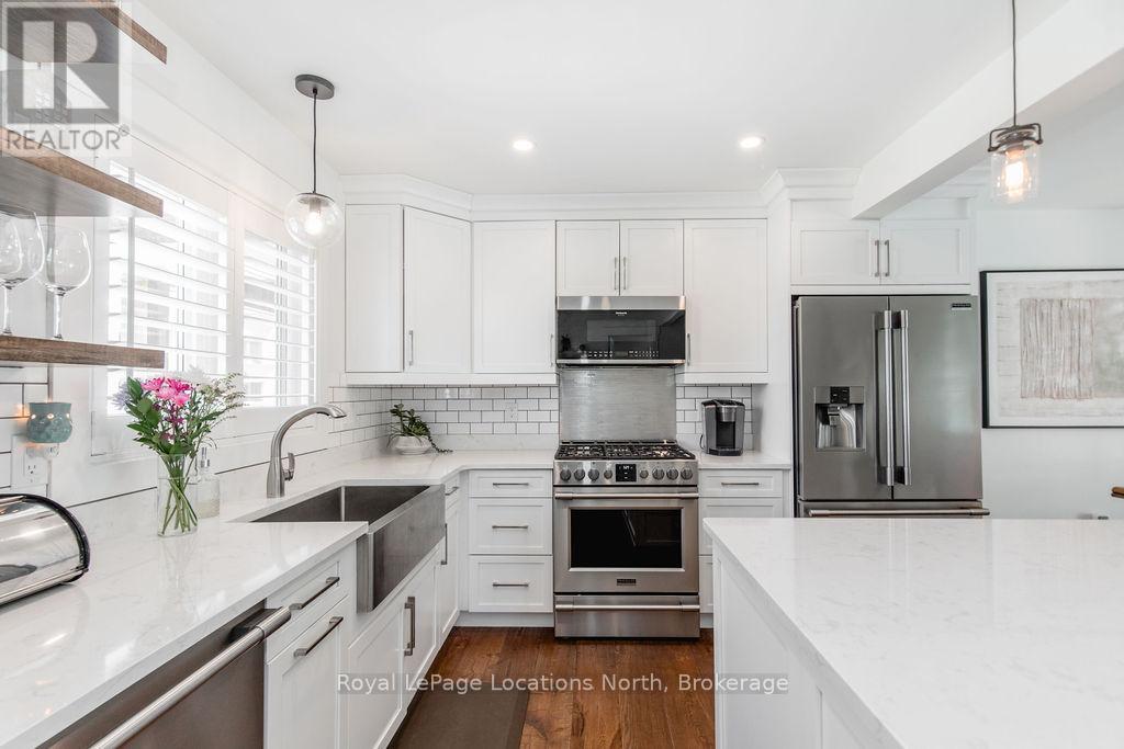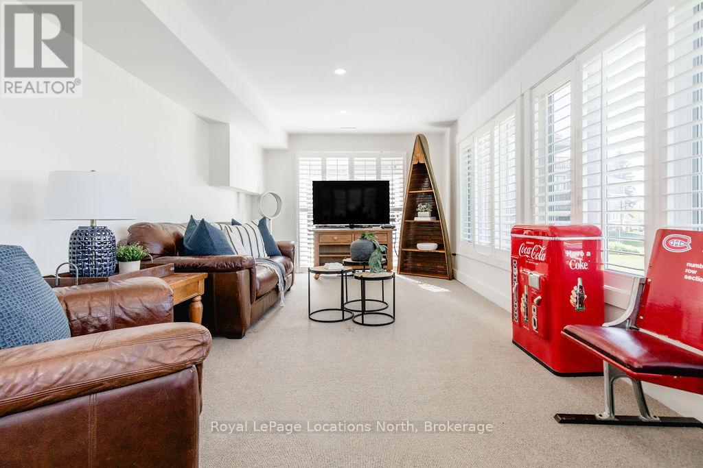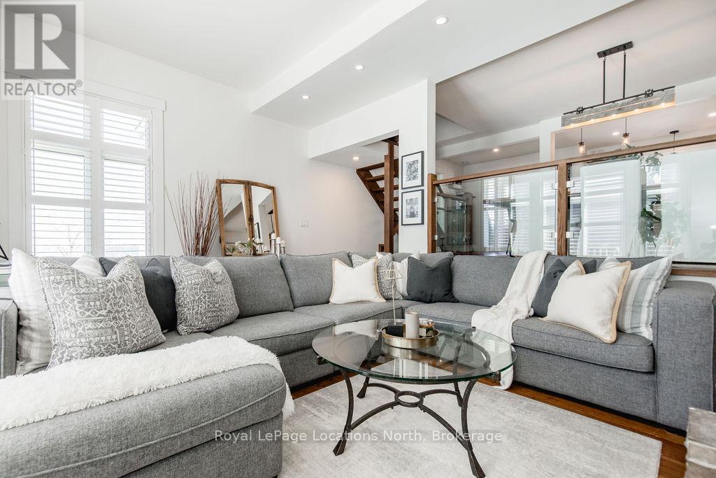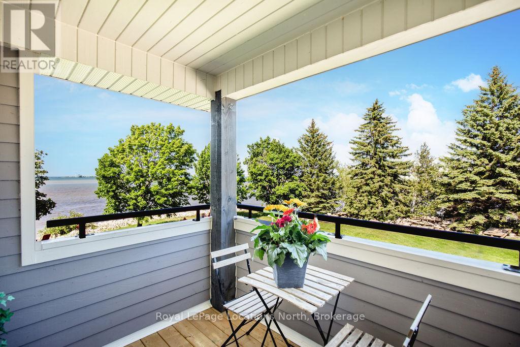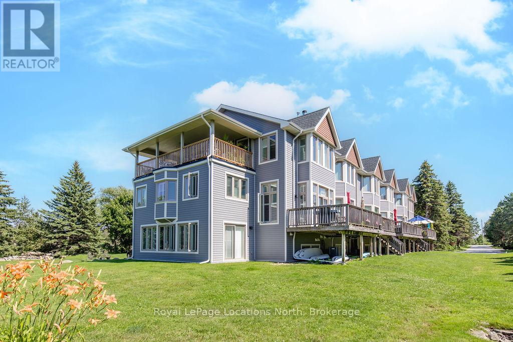 This is a RARE + EXCEPTIONAL property-an absolute gem w/ nothing comparable in all of Collingwood. Experience waterfront living at its finest in this stunning waterfront condo. Recharge on the brand new covered deck, measuring 25'9" x 11'1", your personal oasis for entertaining guests, admiring breathtaking sunsets, or simply unwinding w/ a good book. With maintenance-free living inside & out, you'll have more time to soak in the beauty of the Georgian Bay. This home has undergone a complete interior/exterior renovation, w/stunning rustic wide plank flooring, new stairs w/glass railings to brighten up the space + upgraded baseboard/trim to add a touch of elegance while keeping that upscale vibe. The custom kitchen was designed to be open-concept to the dining area w/ large island perfect for entertaining + quartz countertops. The dining overlooks the cozy living room w/stone fireplace, tall ceilings + walkout to another fabulous deck. An additional main floor family room is a favorite, surrounded by windows offering panoramic views of the bay. Perfect room to double as an art studio, office or gym w/measurements of 25.9x11.3ft. Waking up in the main floor primary bedroom is like a dream w/views for miles, while enjoying the luxury of heated floors every morning in the newly renovated ensuite. The 3rd level features 3 additional bedrooms + fully renovated bathroom. Indulge yourself after a day on the ski hills in the "spa" like room with a jacuzzi tub + sauna, adding a touch of relaxation to your lakeside retreat. Outside, the community amenities are equally impressive,w/outdoor saltwater pool, PICKLEBALL/tennis courts, a private sand beach area, + watercraft launch ramp. Downtown Collingwood is a short drive away with great dining + activities. Whether you're seeking a full-time residence/a weekend getaway, this waterfront haven has it all. Add incl- California shutters, gas hook up for BBQ, all newer appliances, upgraded lighting, New AC (1yr), new exterior. (id:4069)