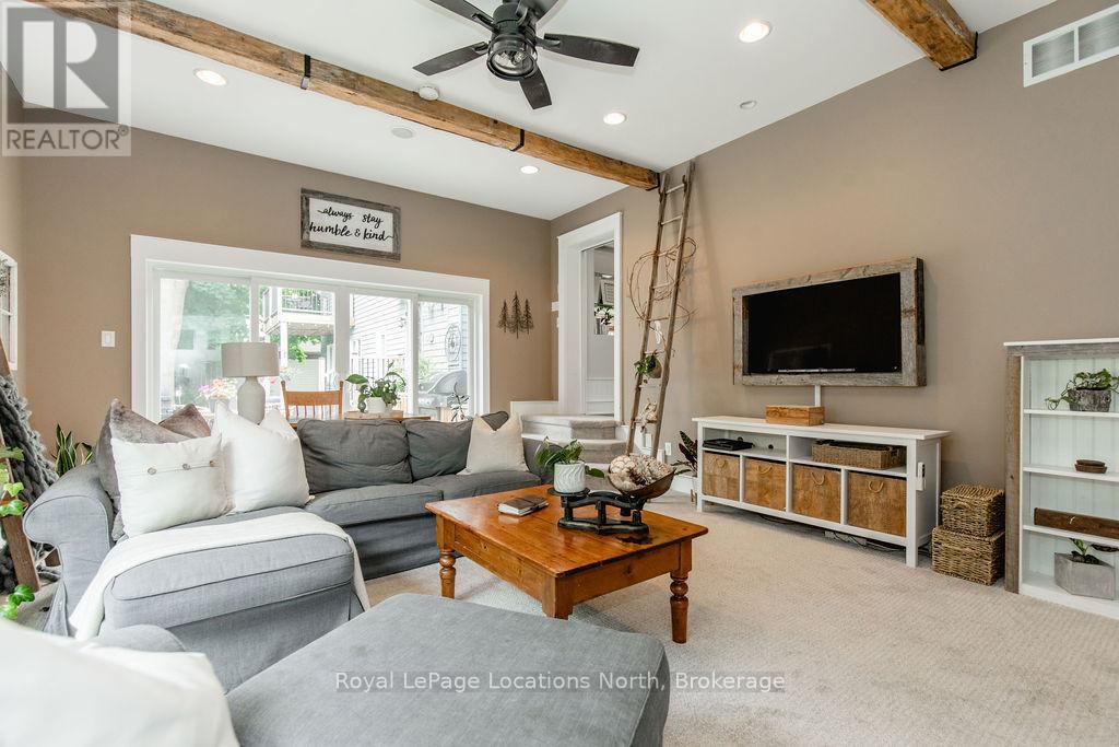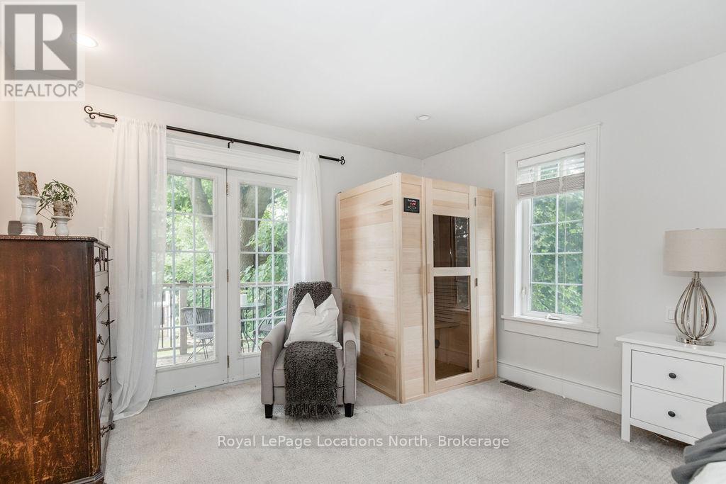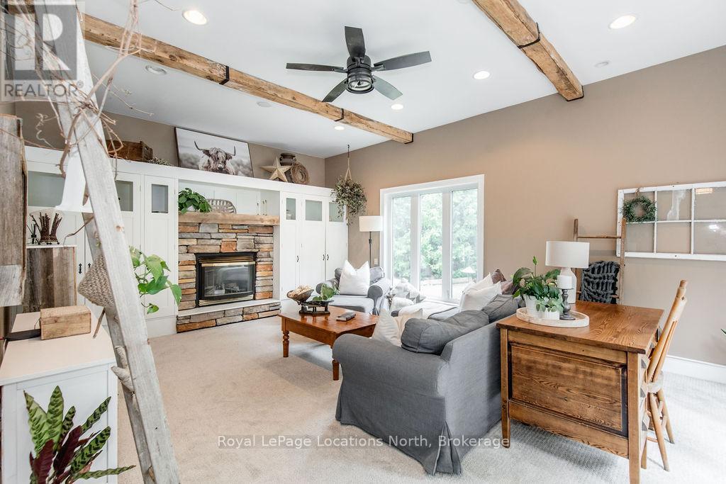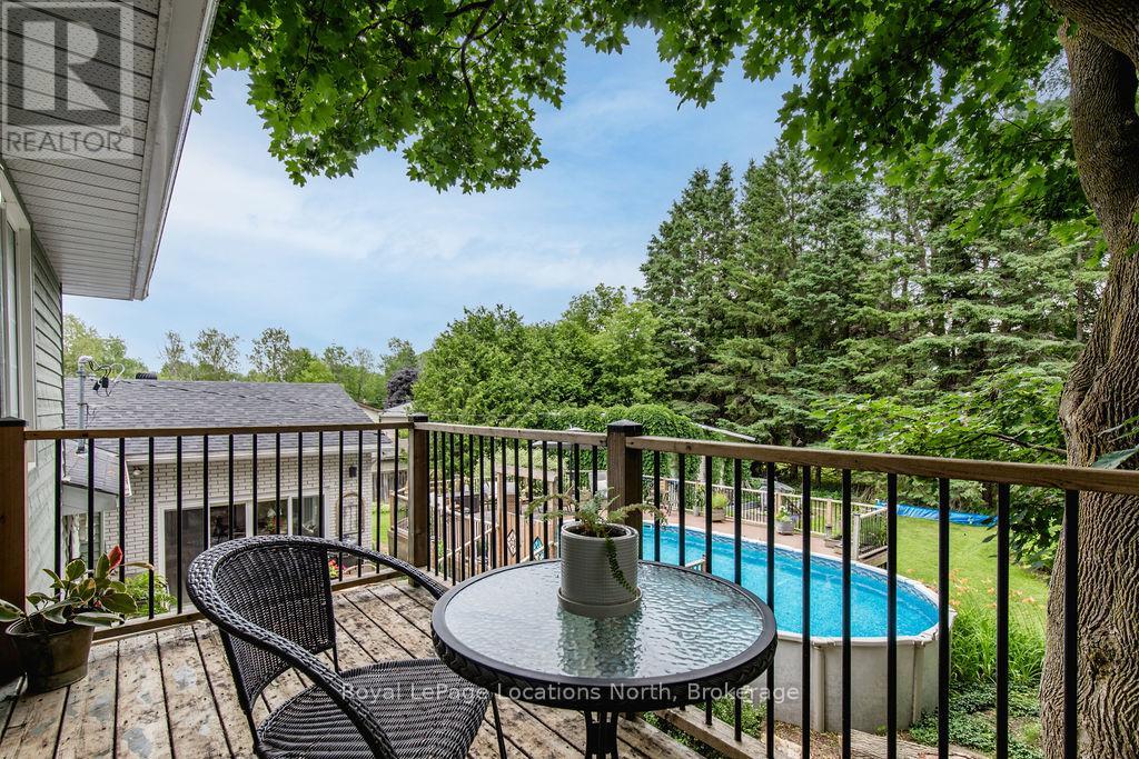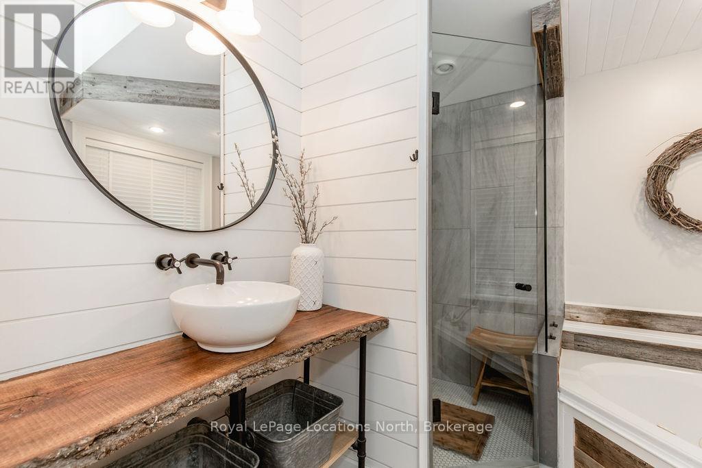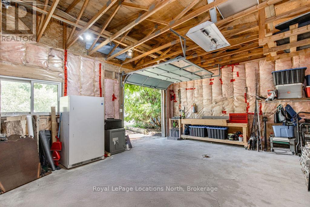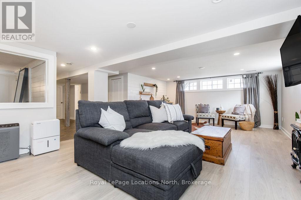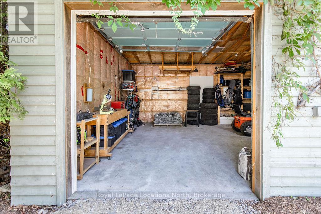 DETACHED SHOP + SECOND DRIVEWAY. In Law capability. Welcome to this charming piece of paradise in the heart of Stayner. Nestled on a PRIVATE 93' x 158' lot surrounded by mature trees, this beautifully updated 4-bedroom, 4-bathroom home offers exceptional space, comfort, and privacy. The backyard is an entertainers dream featuring an above-ground pool with a large composite deck, hot tub, outdoor kitchen, dining area, lounging zones, and a cedar sauna. A cozy she shed adds the perfect escape for quiet moments. One of the standout features is the detached oversized garage/shop with soaring ceilings, hydro, and its own driveway is deal for a workshop, home business, or extra storage. There's also ample room to park boats, trailers, or multiple vehicles. Inside, the home impresses with a stylish front mudroom/laundry with barn door, two bedrooms, and a full bathroom on the entry level. The main floor offers a spacious dining area with room for a harvest table, a classic kitchen with quartz counters, farmhouse sink, breakfast bar, and stainless steel appliances, along with a large living room and sunken family room with vaulted ceilings, gas fireplace, built-ins, and walkout to the backyard. The primary suite includes a Juliet balcony, 4-piece ensuite, and a 2024 custom closet system. The lower level adds even more living space with a rec room, new wet bar with wine fridge and butcher block counters, a 3-piece bath, and an exercise room across from the sauna. Additional highlights include an RO water system, 2015 AC and furnace, extra attic insulation, built-in sound system, and a full renovation completed in 2002. Looking for a unique home that is meticulous- this is the one! (id:4069)