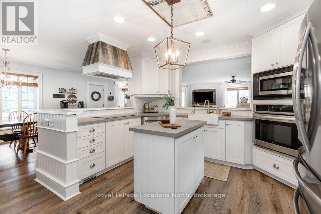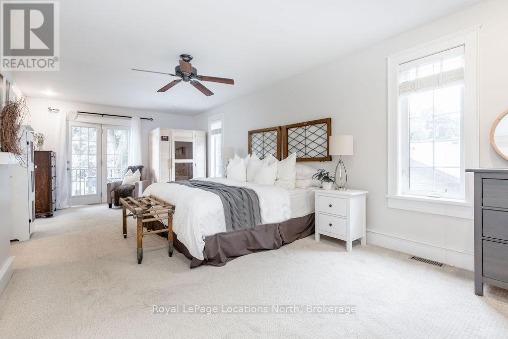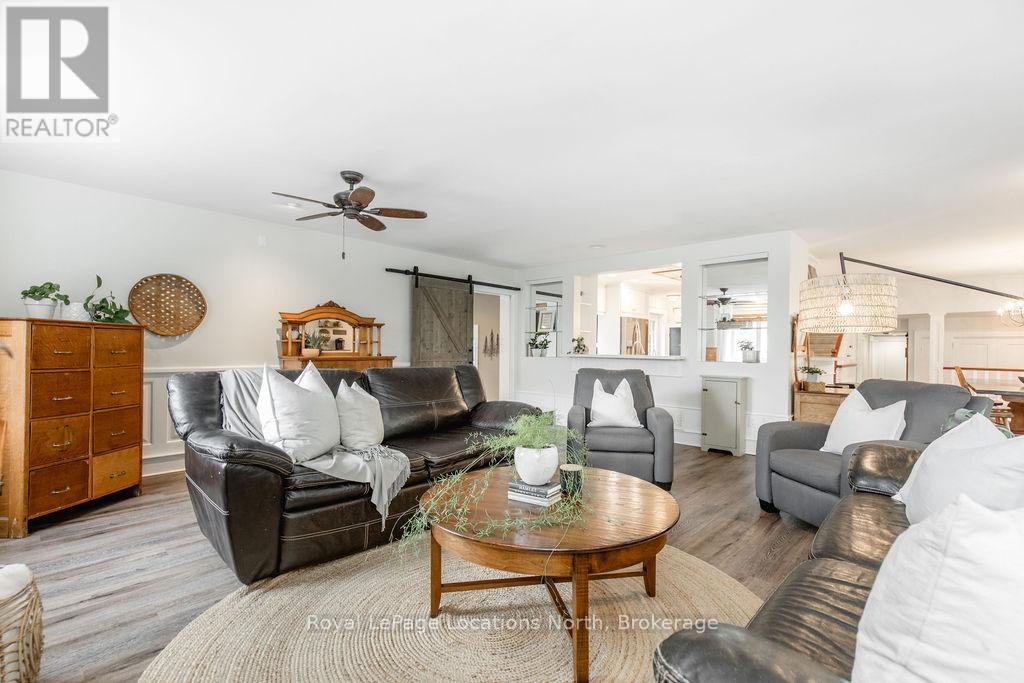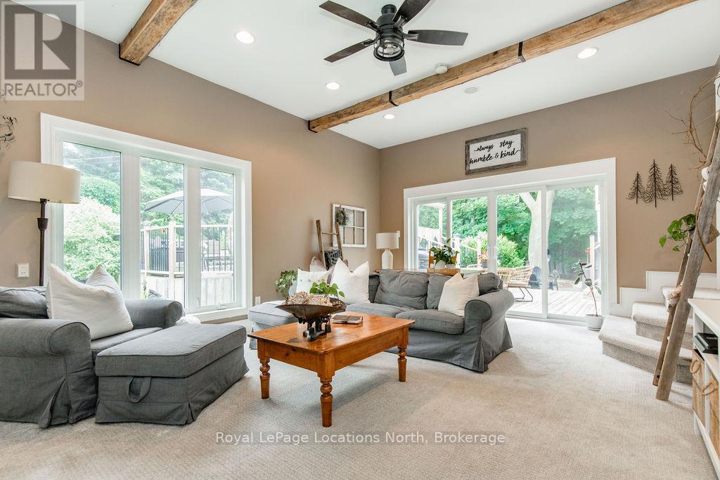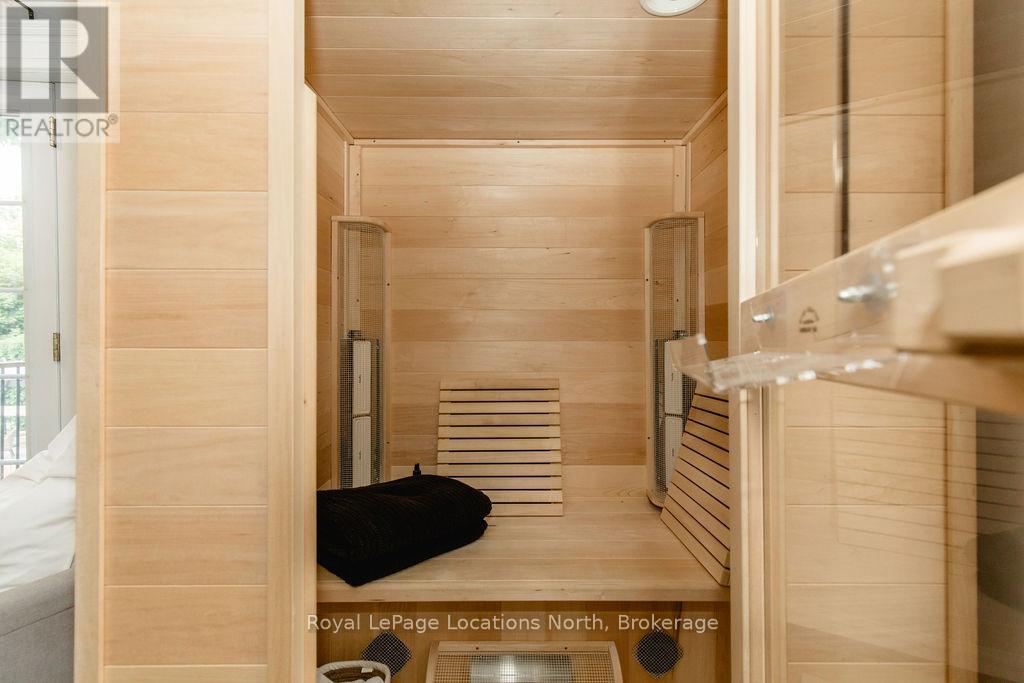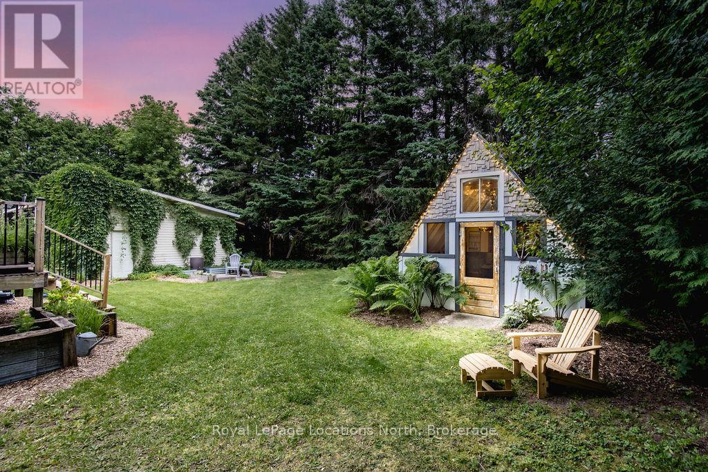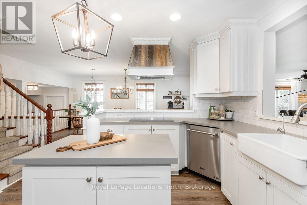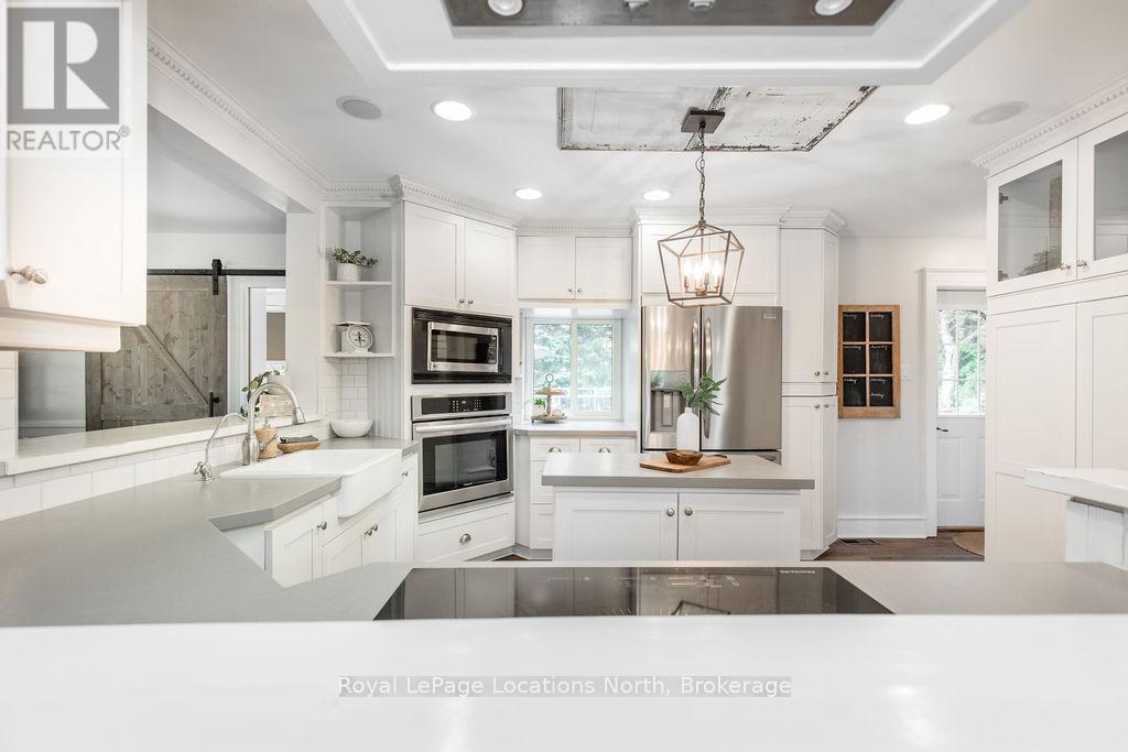 DETACHED SHOP + SECOND DRIVEWAY. In Law capability. Welcome to this charming piece of paradise in the heart of Stayner. Nestled on a PRIVATE 93' x 158' lot surrounded by mature trees, this beautifully updated 4-bedroom, 4-bathroom home offers exceptional space, comfort, and privacy. The backyard is an entertainers dream featuring an above-ground pool with a large composite deck, hot tub, outdoor kitchen, dining area, lounging zones, and a cedar sauna. A cozy she shed adds the perfect escape for quiet moments. One of the standout features is the detached oversized garage/shop with soaring ceilings, hydro, and its own driveway is deal for a workshop, home business, or extra storage. There's also ample room to park boats, trailers, or multiple vehicles. Inside, the home impresses with a stylish front mudroom/laundry with barn door, two bedrooms, and a full bathroom on the entry level. The main floor offers a spacious dining area with room for a harvest table, a classic kitchen with quartz counters, farmhouse sink, breakfast bar, and stainless steel appliances, along with a large living room and sunken family room with vaulted ceilings, gas fireplace, built-ins, and walkout to the backyard. The primary suite includes a Juliet balcony, 4-piece ensuite, and a 2024 custom closet system. The lower level adds even more living space with a rec room, new wet bar with wine fridge and butcher block counters, a 3-piece bath, and an exercise room across from the sauna. Additional highlights include an RO water system, 2015 AC and furnace, extra attic insulation, built-in sound system, and a full renovation completed in 2002. Looking for a unique home that is meticulous- this is the one! (id:4069)