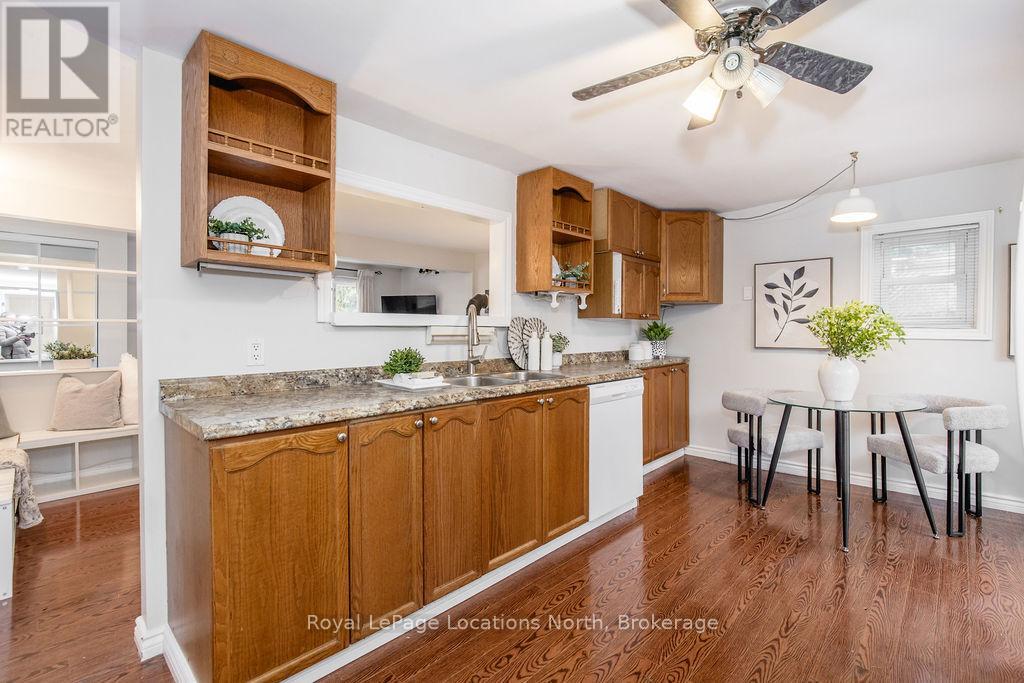 Just Steps to the Beach - The Perfect 4-Season Getaway or Year-Round Home. Welcome to a cozy 3-bedroom, 1-bathroom ranch bungalow tucked on a private 50 x 120 ft lot, only a short stroll to the sandy shores. Whether you're dreaming of a weekend cottage, your first home, or a comfortable place to retire, this property fits beautifully into every stage of life. Inside, the living room invites you to curl up by the gas fireplace after a day at the beach or on the ski hill. The spacious kitchen gives you plenty of room to cook and entertain, with a walkout that leads to a back deck overlooking a private, tree-lined yard , complete with a firepit for those warm summer nights with family and friends. Three large sheds provide extra storage options. There's also a laundry hook-up ready to go. Location is everything, and here you're in the heart of it all: walk to Starbucks, Tim Hortons, restaurants, and local shopping. Enjoy the ease of gas/baseboard heat, municipal water and sewer, and true 4-season living. And when winter rolls around? Blue Mountain is just a quick 15-minute drive. A simple, comfortable home in the perfect spot and exactly where you want to be. (id:4069)