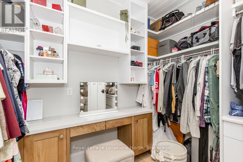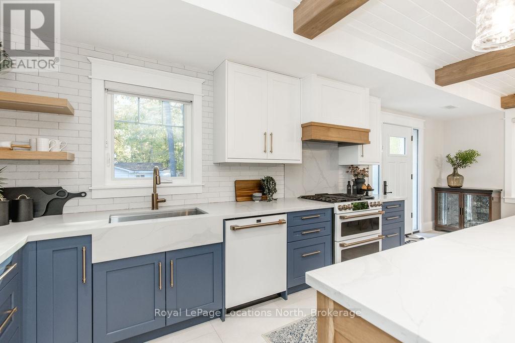 DREAM HOME - Welcome to this stunning, custom-built 3-bed, 3-bath home showcasing exceptional craftsmanship, built in 2023, perfectly positioned backing onto protected land & directly across from the river in beautiful Wasaga Beach. Designed w/ a mix of modern luxury & timeless character, this home captures a century-home feel with its large mouldings, custom doors, & wood beams with a custom-built stone fireplace accenting the main floor. Inside, the bright open-concept layout features wall-to-wall windows overlooking the forest, flooding the space w/ natural light. The custom kitchen is a true showpiece, showcasing a large quartz island, blue and white cabinetry, a mini wine fridge, & a full quartz backsplash. It's finished w/ a high-end signature line of Wi-Fi-enabled appliances, combining elegance & smart convenience for the modern homeowner. The dining area sits beside large windows, while the living room offers aged wood ceiling beams and tongue-and-groove ceilings that bring warmth & texture throughout along w/ the wide-plank white oak hardwood. Upstairs the hardwood stairs, lead to spacious bedrooms, each w/ custom walk-in closets, built-in desks, shiplap ceilings, & designer touches like wallpaper accents & skylights. The primary suite feels like a retreat, featuring a cozy fireplace, luxurious ensuite w/ floating tub, double quartz sinks, black cabinetry, & a walk-in closet w/ custom cabinetry & make up desk perfect for getting ready for the day.Luxury features include- Inside entry to garage with epoxy flooring + custom storage, hydronic in-floor heating, heated driveway & walkways while outdoors, enjoy the built-in BBQ, rubberized surfacing on patios w/ hot tub hook up, sprinkler system, & tranquil forest backdrop w/ cedar trees surround the patio for privacy.Interior features include motorized blinds, smart home system, security cameras, spray-foam insulation, high-efficiency boiler system, & a hard-wired generator. One to remember! (id:4069)