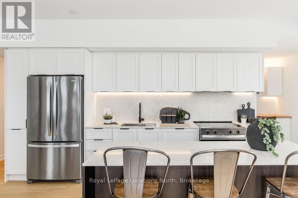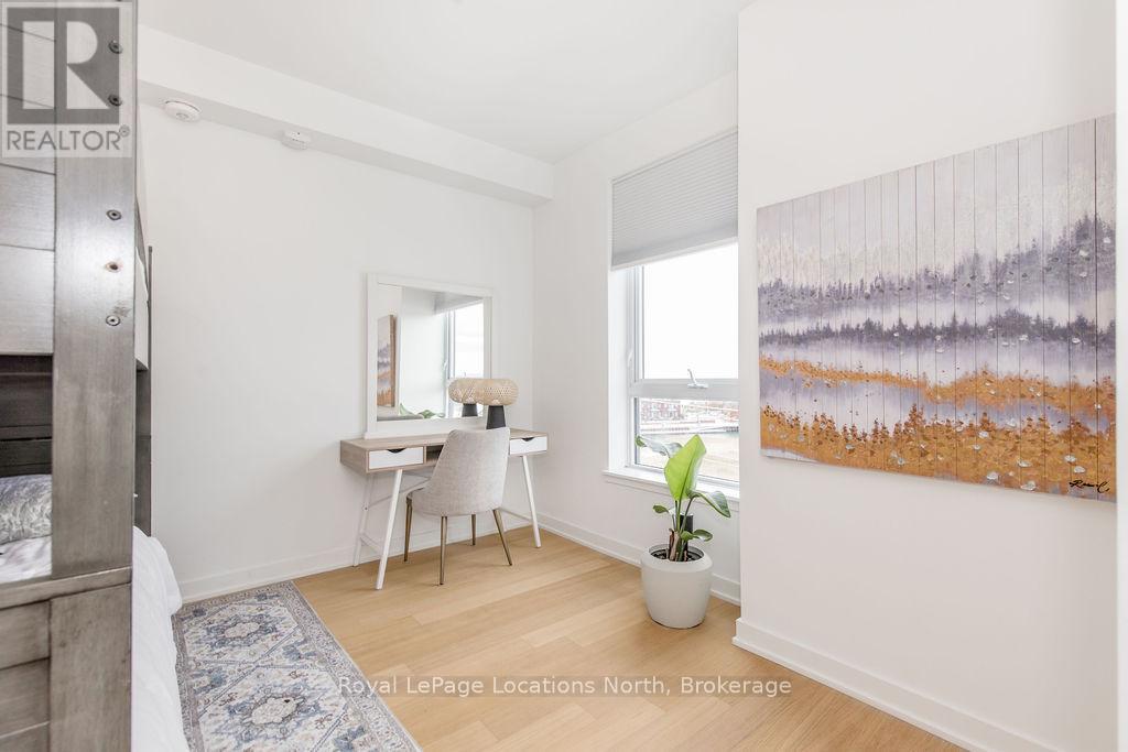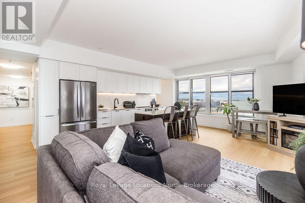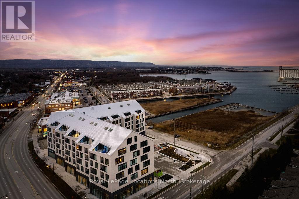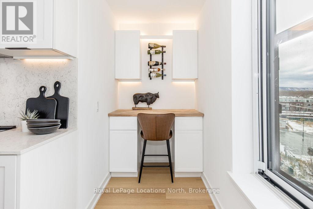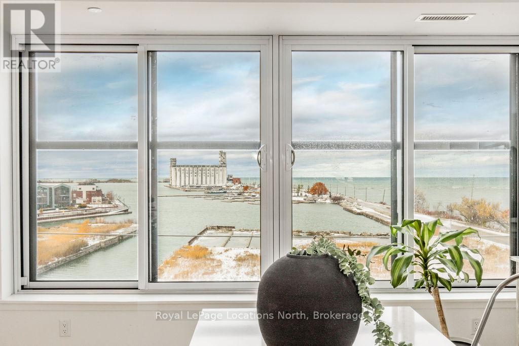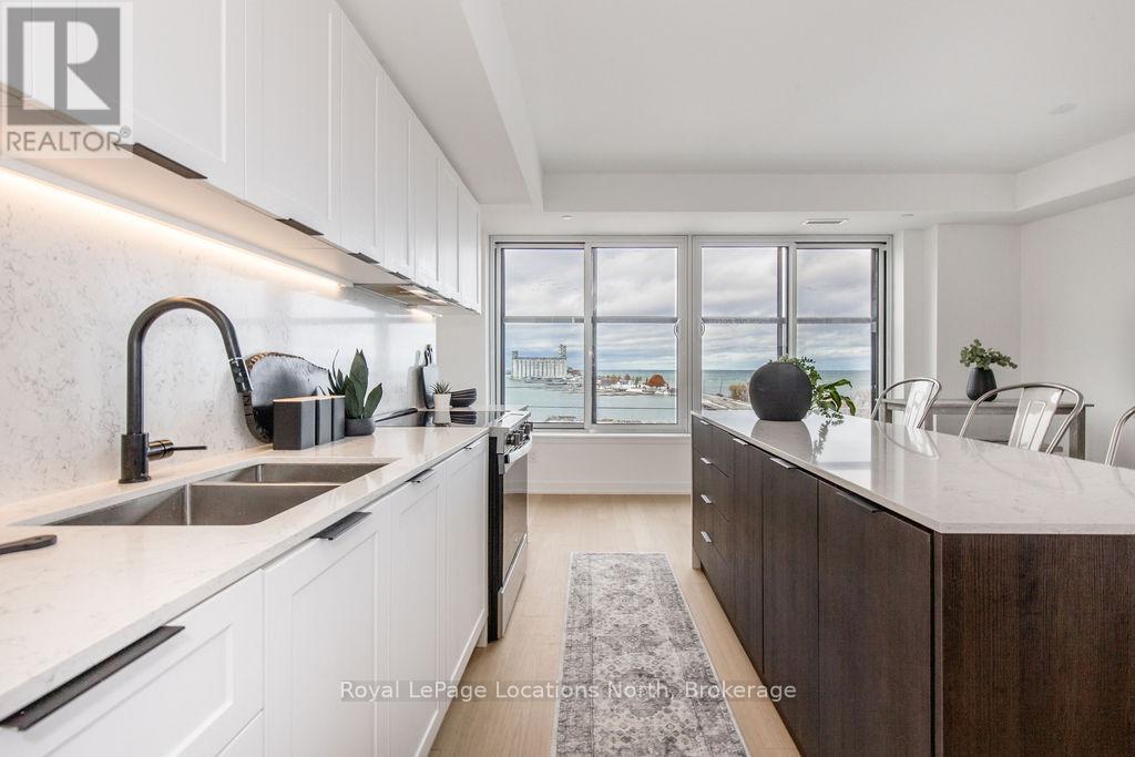 The Best Views in the Building | Day or Night. This is the one everyone talks about. From this unit, you'll watch downtown Collingwood light up at night, see the hills of Blue Mountain glowing in the distance, and take in the harbour with boats and shipyards below. It's a view that never gets old. Set in a modern boutique building, this waterfront condo offers approximately 1,200 sq ft of well-designed living space with 2 bedrooms and 2 bathrooms. The layout is open and inviting, with oversized windows that flood the home with natural light and frame those incredible views from nearly every angle.The kitchen is bright and timeless, finished with classic white cabinetry, quartz countertops with a waterfall edge, a matching quartz backsplash, and a large island that's perfect for both entertaining and everyday living. The open living and dining space flows effortlessly to a 100 sq ft private terrace, creating an ideal spot to enjoy your morning coffee or unwind in the evening as the sun sets over the bay with a glass of wine. A thoughtfully designed built-in desk overlooking the water offers a beautiful and functional space for a home office or creative workspace.Every detail has been thoughtfully finished to create a comfortable, low-maintenance home that suits Collingwood's four-season lifestyle. The building offers excellent amenities including a fitness room, social lounge, guest suites, pet spa, and a rooftop terrace with panoramic views. Secure underground parking adds convenience and storage locker for all your outdoor sporting gear. Just outside your door you're instantly connected to the best of downtown, restaurants, shops, galleries, waterfront trails, and the marina are all just steps away. This is true walkable living, where you can leave the car behind and enjoy everything Collingwood has to offer. (id:4069)