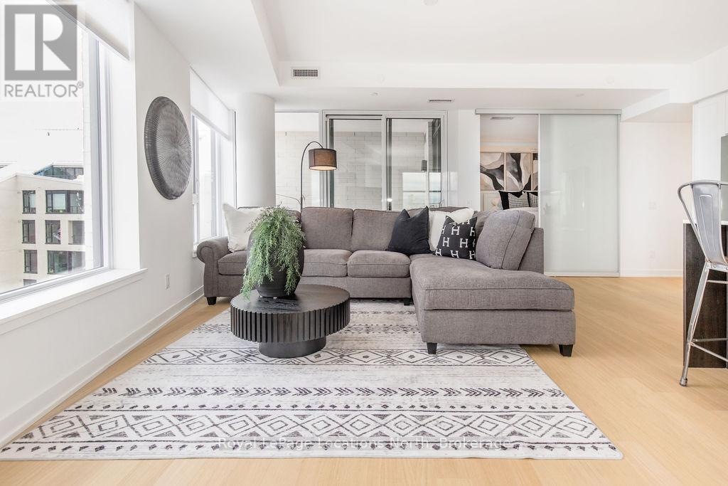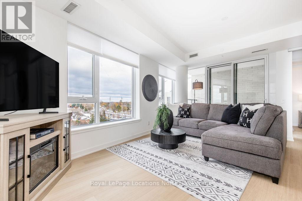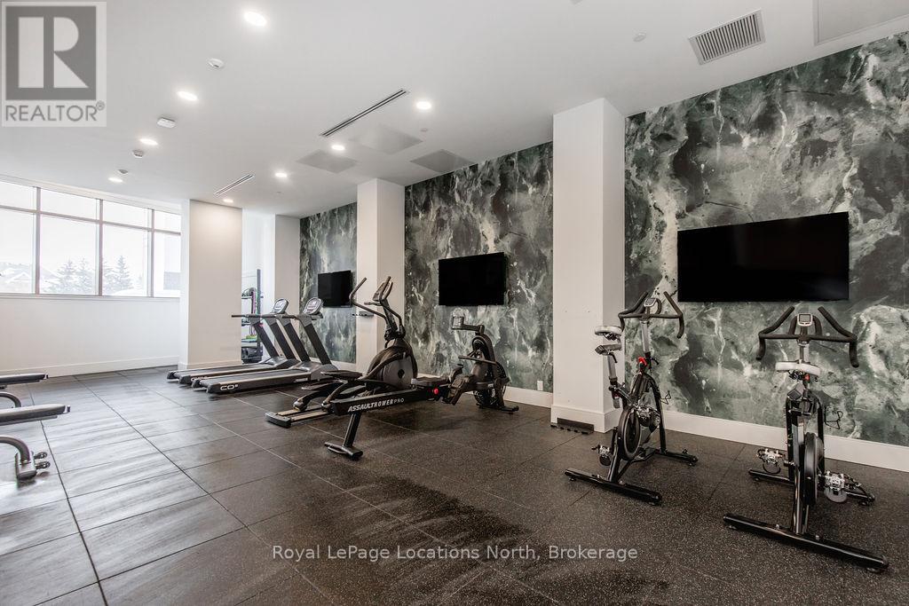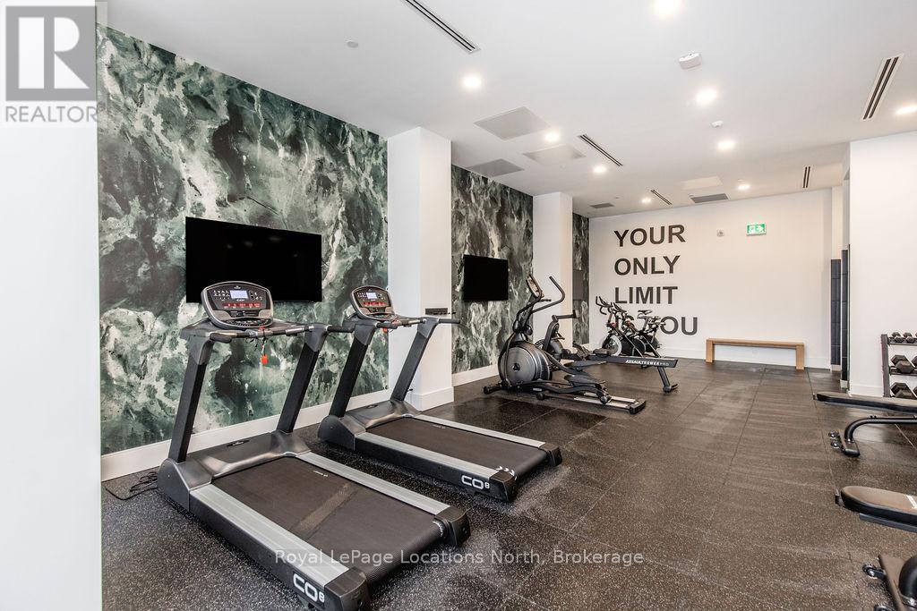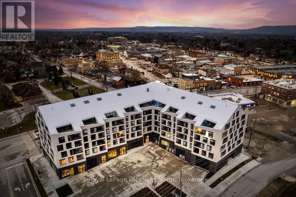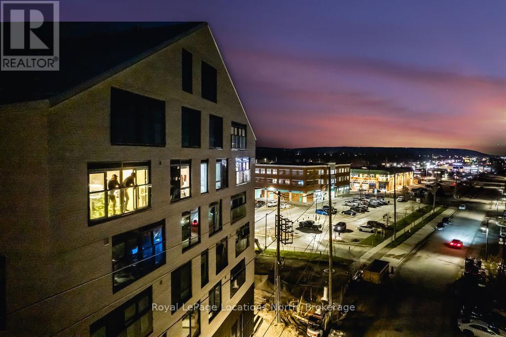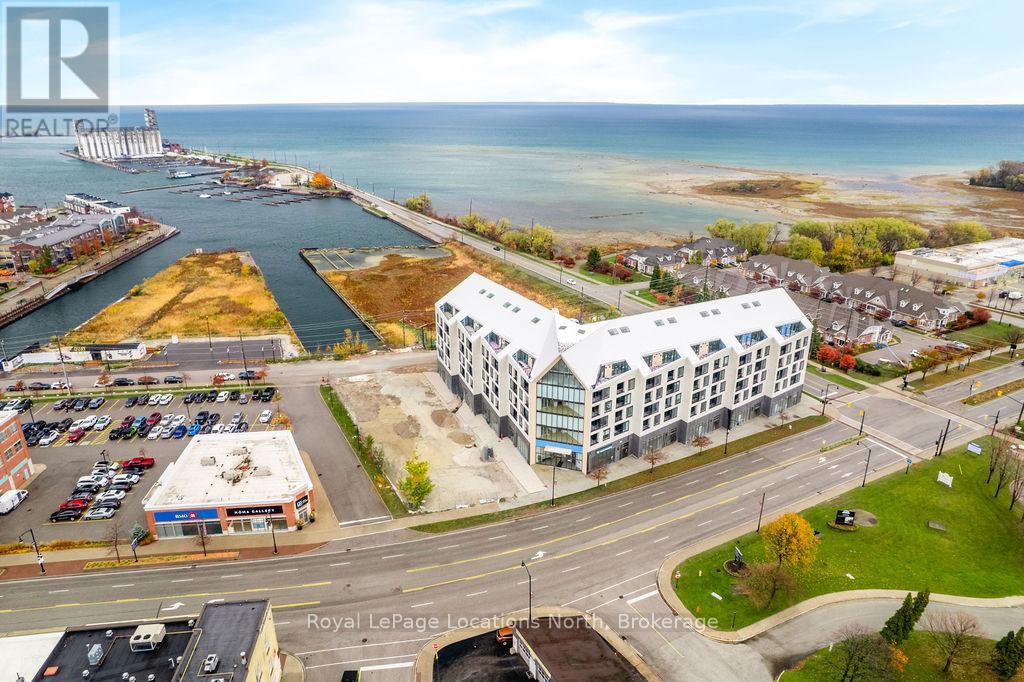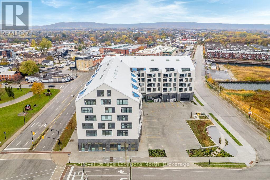 The Best Views in the Building | Day or Night. This is the one everyone talks about. From this unit, you'll watch downtown Collingwood light up at night, see the hills of Blue Mountain glowing in the distance, and take in the harbour with boats and shipyards below. It's a view that never gets old. Set in a modern boutique building, this waterfront condo offers approximately 1,200 sq ft of well-designed living space with 2 bedrooms and 2 bathrooms. The layout is open and inviting, with oversized windows that flood the home with natural light and frame those incredible views from nearly every angle.The kitchen is bright and timeless, finished with classic white cabinetry, quartz countertops with a waterfall edge, a matching quartz backsplash, and a large island that's perfect for both entertaining and everyday living. The open living and dining space flows effortlessly to a 100 sq ft private terrace, creating an ideal spot to enjoy your morning coffee or unwind in the evening as the sun sets over the bay with a glass of wine. A thoughtfully designed built-in desk overlooking the water offers a beautiful and functional space for a home office or creative workspace.Every detail has been thoughtfully finished to create a comfortable, low-maintenance home that suits Collingwood's four-season lifestyle. The building offers excellent amenities including a fitness room, social lounge, guest suites, pet spa, and a rooftop terrace with panoramic views. Secure underground parking adds convenience and storage locker for all your outdoor sporting gear. Just outside your door you're instantly connected to the best of downtown, restaurants, shops, galleries, waterfront trails, and the marina are all just steps away. This is true walkable living, where you can leave the car behind and enjoy everything Collingwood has to offer. (id:4069)