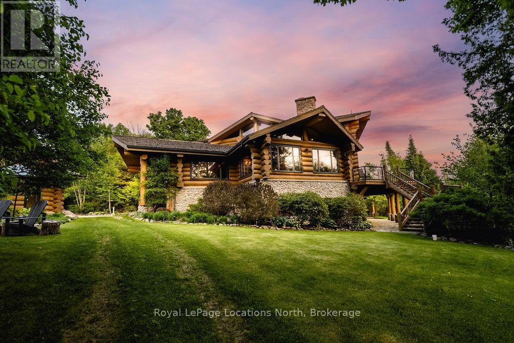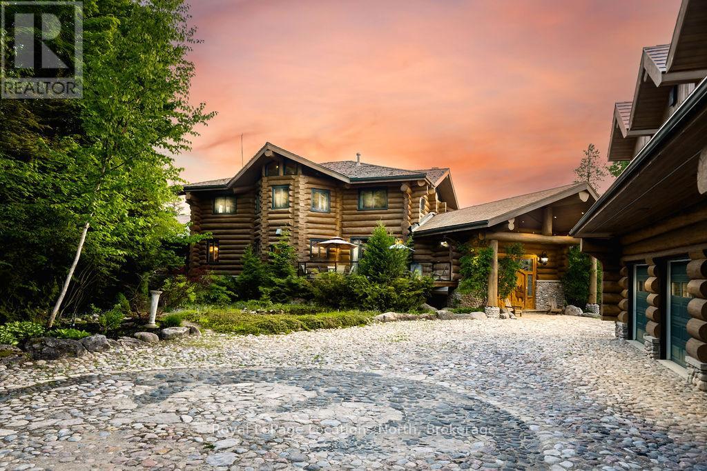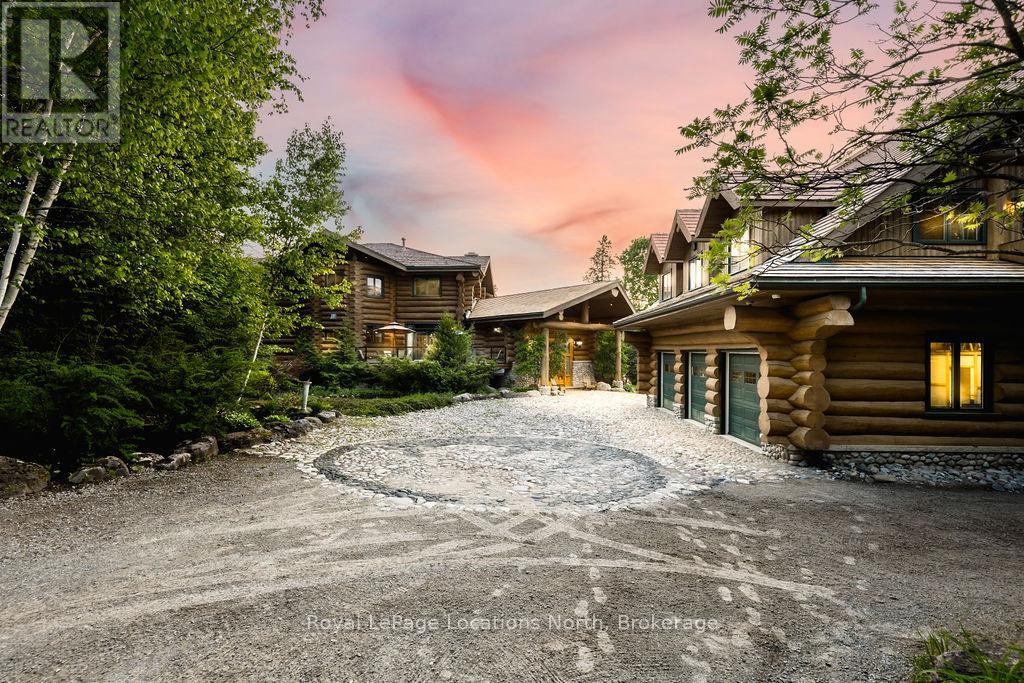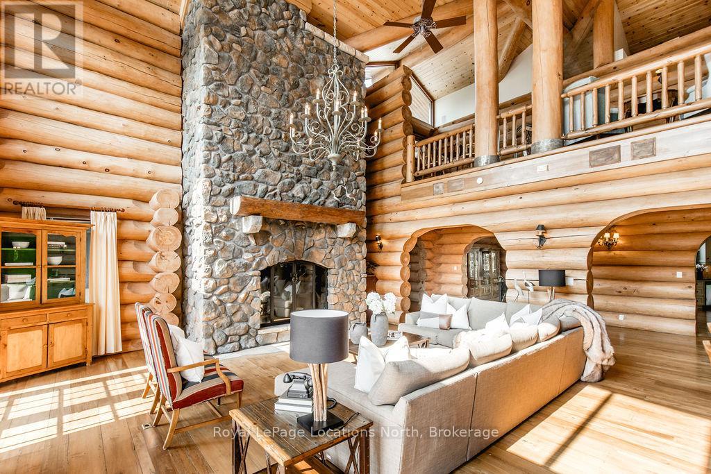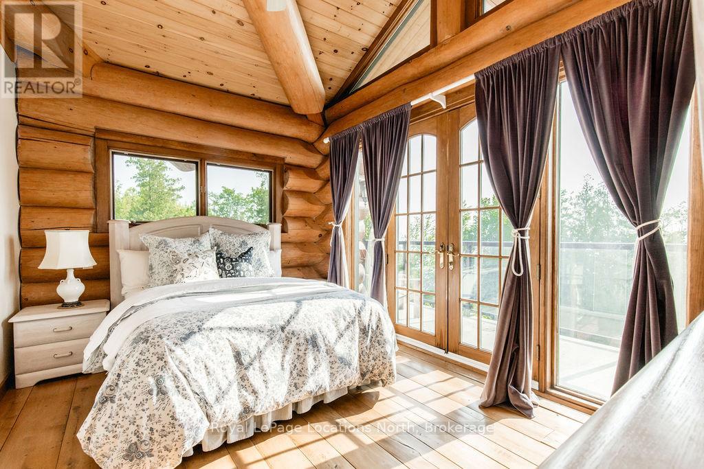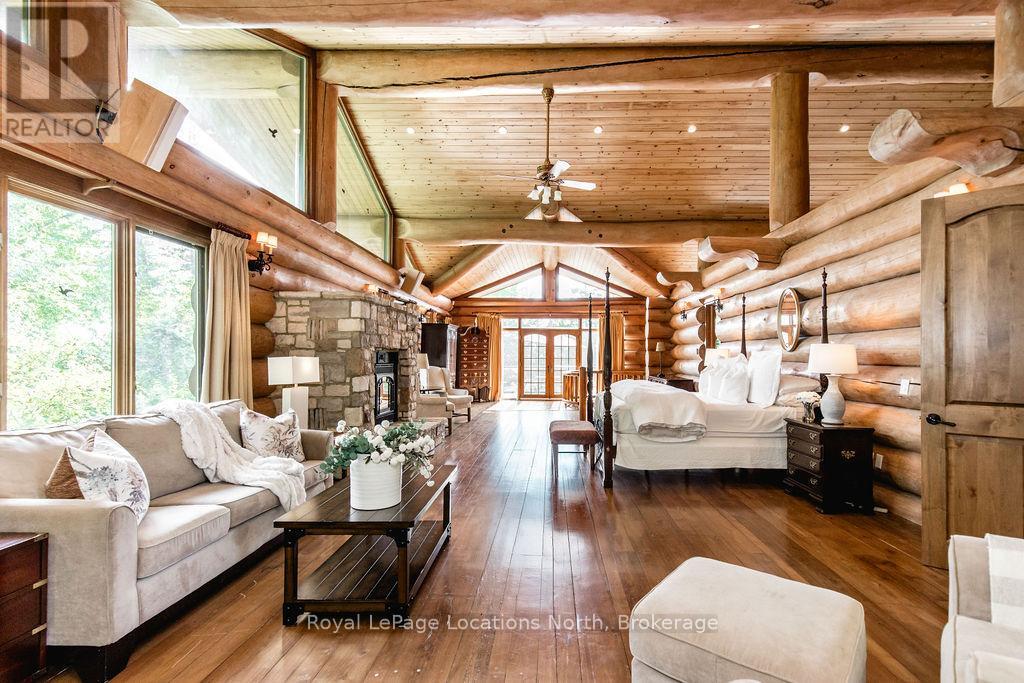 Welcome to one of Canada's most iconic luxury log homes, a rare Georgian Bay waterfront estate often described as the "Yellowstone of the North." Located at the very tip of Cedar Point on Georgian Bay, this one-of-a-kind waterfront mansion offers exceptional privacy, panoramic bay views & an irreplaceable point-of-land setting.Built in 2002 as a private resort-style retreat, this custom log estate sits on 4.37 acres with 412+ ft of shoreline, featuring both sandy & pebble beaches, a 90ft stone pier & an 80ft seasonal dock - ideal for boating, swimming & luxury waterfront living. With approximately 14,000 sq ft of living space, the home showcases master craftsmanship, soaring vaulted ceilings, exposed timber construction & uninterrupted water views from nearly every room.The main residence offers 8 bedrooms & 8 bathrooms, plus separate guest or staff quarters w/ 2 additional bedrooms & 2 bathrooms, making it ideal for multi-generational living, executive retreats or luxury hosting. A striking 20-ft grand foyer w/ hand-carved log doors & a rare carved centerpiece sets the tone for this architectural masterpiece.Designed for entertaining, the home features formal & casual living areas, a chef's kitchen with premium Dacor, Thermador & Sub-Zero appliances, butler's pantry, stone fireplaces, wet bar, private office & a spectacular main-floor primary suite with vaulted ceilings, spa-style ensuite & private waterfront deck. The walk-out lower level includes a newly constructed accessible bedroom w/ ensuite, games room, gym, home theatre & an unforgettable 20-seat English-style pub.Outdoors, enjoy landscaped grounds, gentle streams, cabana, private beach & an 8-person in-ground hot tub. Additional features include in-floor radiant heating, heated 4-car garage, cedar shingle roof, irrigation system, cobblestone driveway, Starlink high-speed internet & reliable cell service. A true Georgian Bay luxury estate, offering rare frontage, resort-level amenities & legacy-level valu (id:4069)