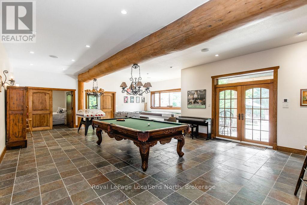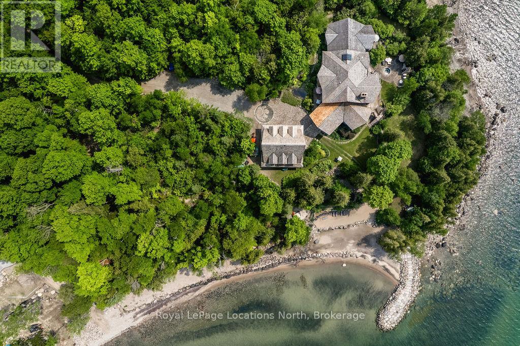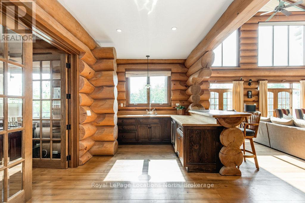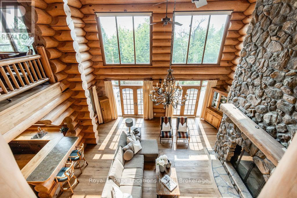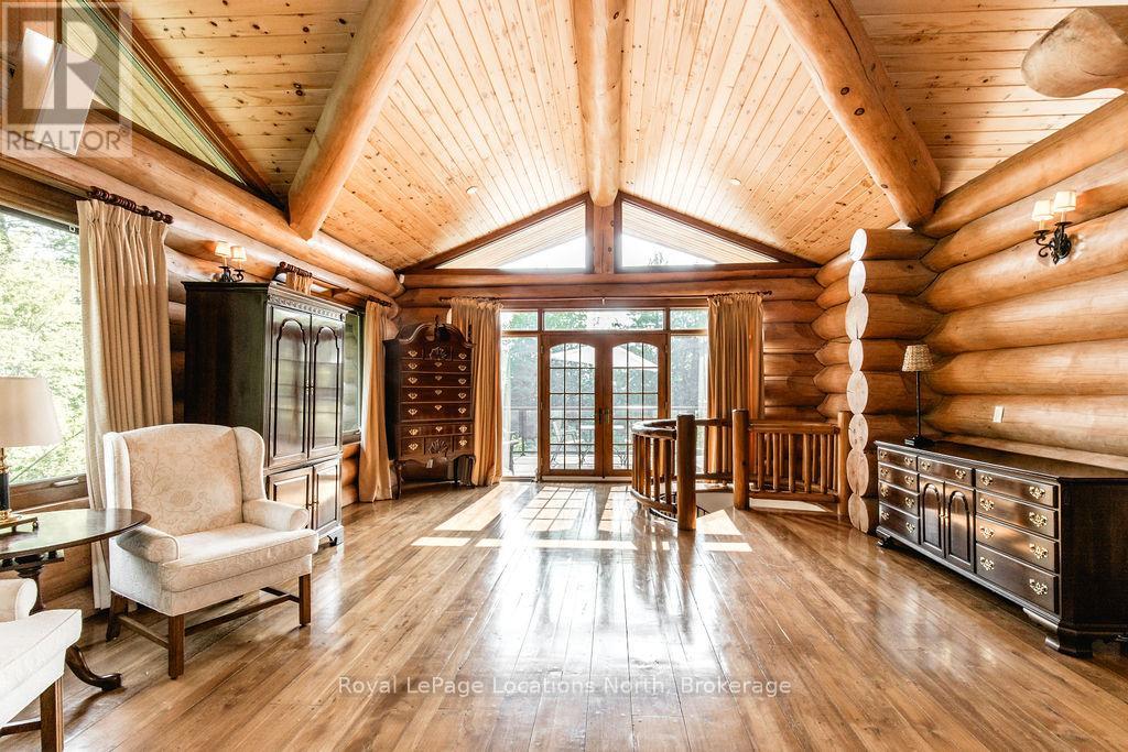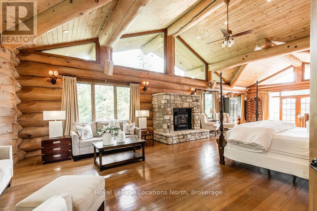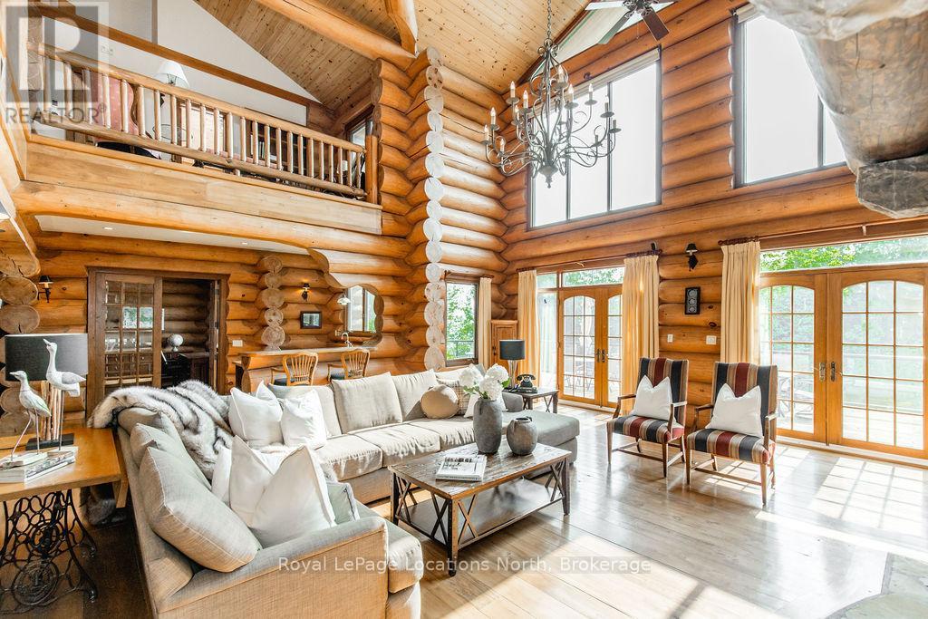 Welcome to one of Canada's most iconic luxury log homes, a rare Georgian Bay waterfront estate often described as the "Yellowstone of the North." Located at the very tip of Cedar Point on Georgian Bay, this one-of-a-kind waterfront mansion offers exceptional privacy, panoramic bay views & an irreplaceable point-of-land setting.Built in 2002 as a private resort-style retreat, this custom log estate sits on 4.37 acres with 412+ ft of shoreline, featuring both sandy & pebble beaches, a 90ft stone pier & an 80ft seasonal dock - ideal for boating, swimming & luxury waterfront living. With approximately 14,000 sq ft of living space, the home showcases master craftsmanship, soaring vaulted ceilings, exposed timber construction & uninterrupted water views from nearly every room.The main residence offers 8 bedrooms & 8 bathrooms, plus separate guest or staff quarters w/ 2 additional bedrooms & 2 bathrooms, making it ideal for multi-generational living, executive retreats or luxury hosting. A striking 20-ft grand foyer w/ hand-carved log doors & a rare carved centerpiece sets the tone for this architectural masterpiece.Designed for entertaining, the home features formal & casual living areas, a chef's kitchen with premium Dacor, Thermador & Sub-Zero appliances, butler's pantry, stone fireplaces, wet bar, private office & a spectacular main-floor primary suite with vaulted ceilings, spa-style ensuite & private waterfront deck. The walk-out lower level includes a newly constructed accessible bedroom w/ ensuite, games room, gym, home theatre & an unforgettable 20-seat English-style pub.Outdoors, enjoy landscaped grounds, gentle streams, cabana, private beach & an 8-person in-ground hot tub. Additional features include in-floor radiant heating, heated 4-car garage, cedar shingle roof, irrigation system, cobblestone driveway, Starlink high-speed internet & reliable cell service. A true Georgian Bay luxury estate, offering rare frontage, resort-level amenities & legacy-level valu (id:4069)