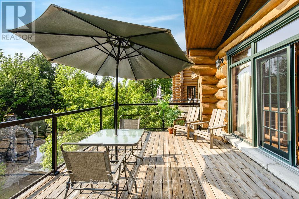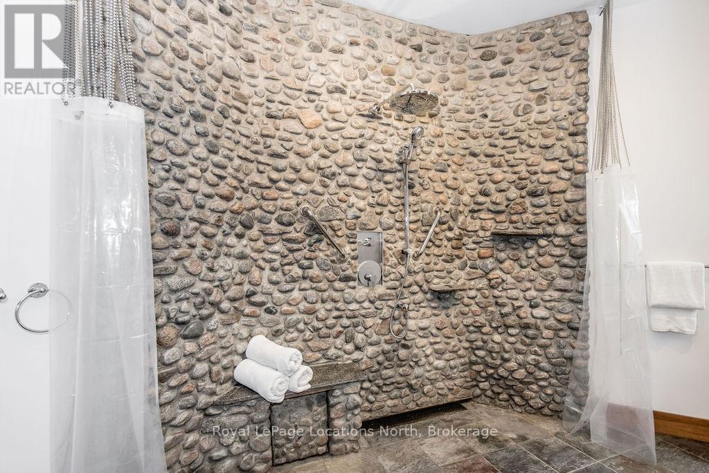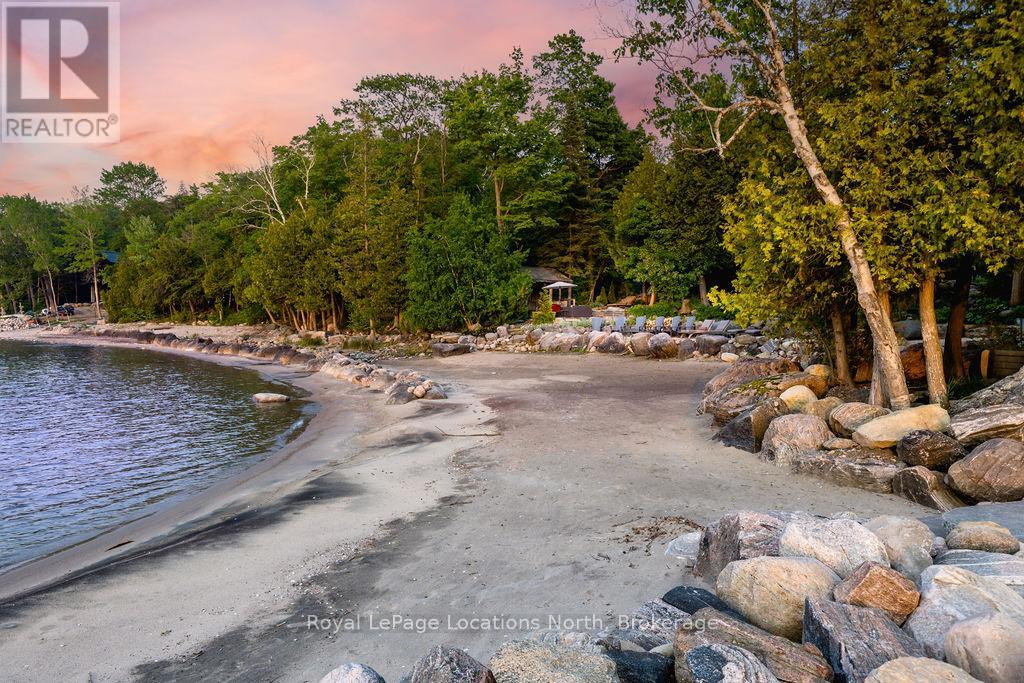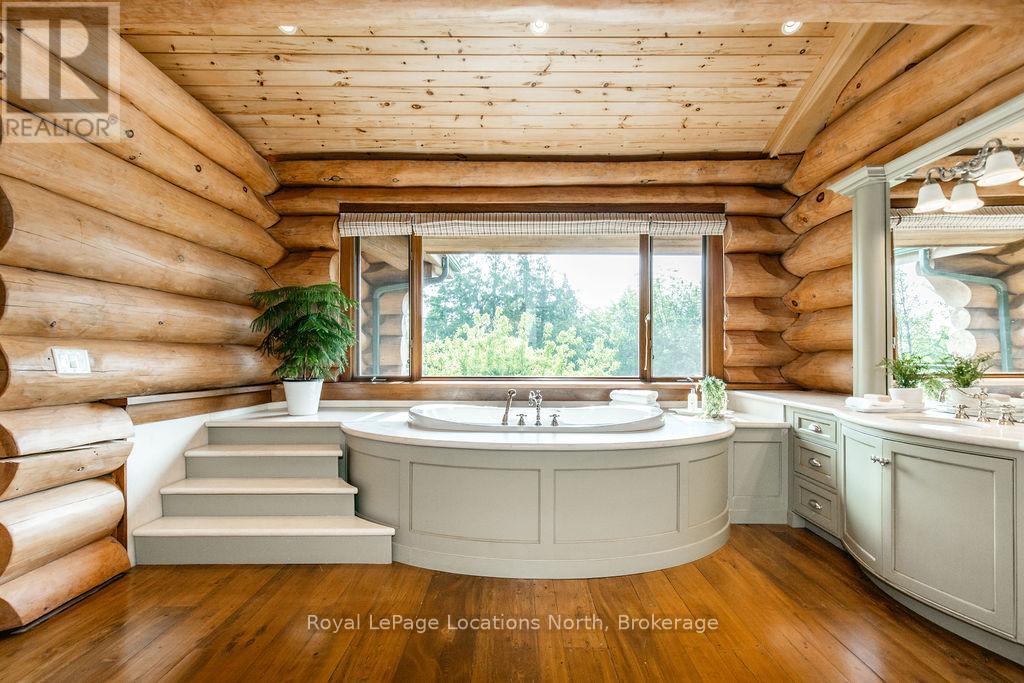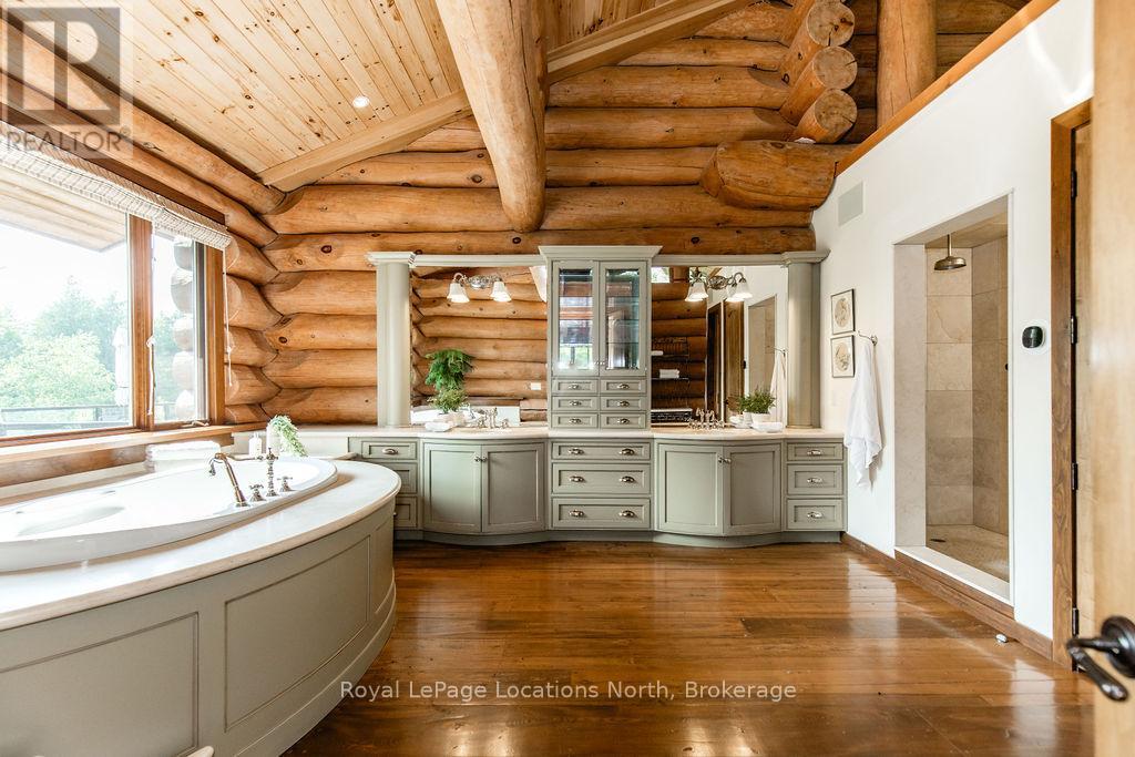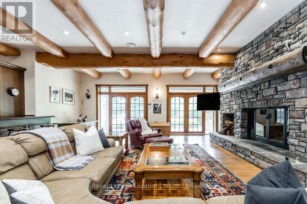Welcome to one of Canada's most iconic luxury log homes, a rare Georgian Bay waterfront estate often described as the "Yellowstone of the North." Located at the very tip of Cedar Point on Georgian Bay, this one-of-a-kind waterfront mansion offers exceptional privacy, panoramic bay views & an irreplaceable point-of-land setting.Built in 2002 as a private resort-style retreat, this custom log estate sits on 4.37 acres with 412+ ft of shoreline, featuring both sandy & pebble beaches, a 90ft stone pier & an 80ft seasonal dock - ideal for boating, swimming & luxury waterfront living. With approximately 14,000 sq ft of living space, the home showcases master craftsmanship, soaring vaulted ceilings, exposed timber construction & uninterrupted water views from nearly every room.The main residence offers 8 bedrooms & 8 bathrooms, plus separate guest or staff quarters w/ 2 additional bedrooms & 2 bathrooms, making it ideal for multi-generational living, executive retreats or luxury hosting. A striking 20-ft grand foyer w/ hand-carved log doors & a rare carved centerpiece sets the tone for this architectural masterpiece.Designed for entertaining, the home features formal & casual living areas, a chef's kitchen with premium Dacor, Thermador & Sub-Zero appliances, butler's pantry, stone fireplaces, wet bar, private office & a spectacular main-floor primary suite with vaulted ceilings, spa-style ensuite & private waterfront deck. The walk-out lower level includes a newly constructed accessible bedroom w/ ensuite, games room, gym, home theatre & an unforgettable 20-seat English-style pub.Outdoors, enjoy landscaped grounds, gentle streams, cabana, private beach & an 8-person in-ground hot tub. Additional features include in-floor radiant heating, heated 4-car garage, cedar shingle roof, irrigation system, cobblestone driveway, Starlink high-speed internet & reliable cell service. A true Georgian Bay luxury estate, offering rare frontage, resort-level amenities & legacy-level valu (id:4069)