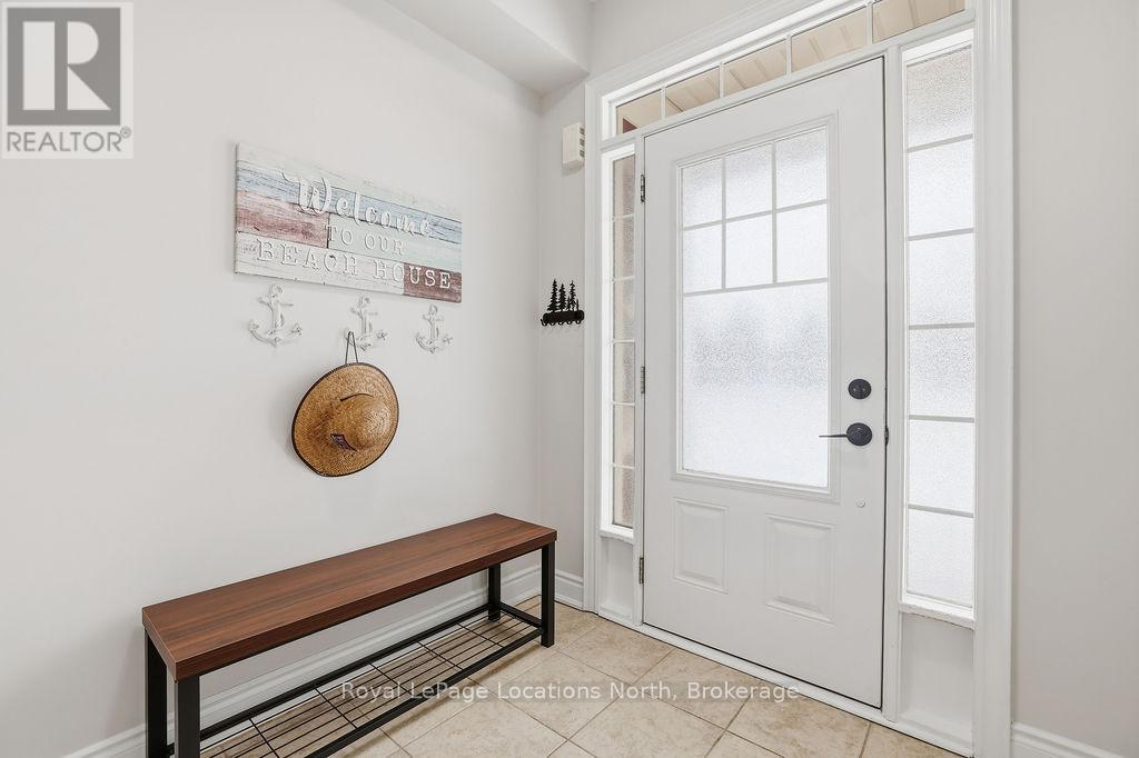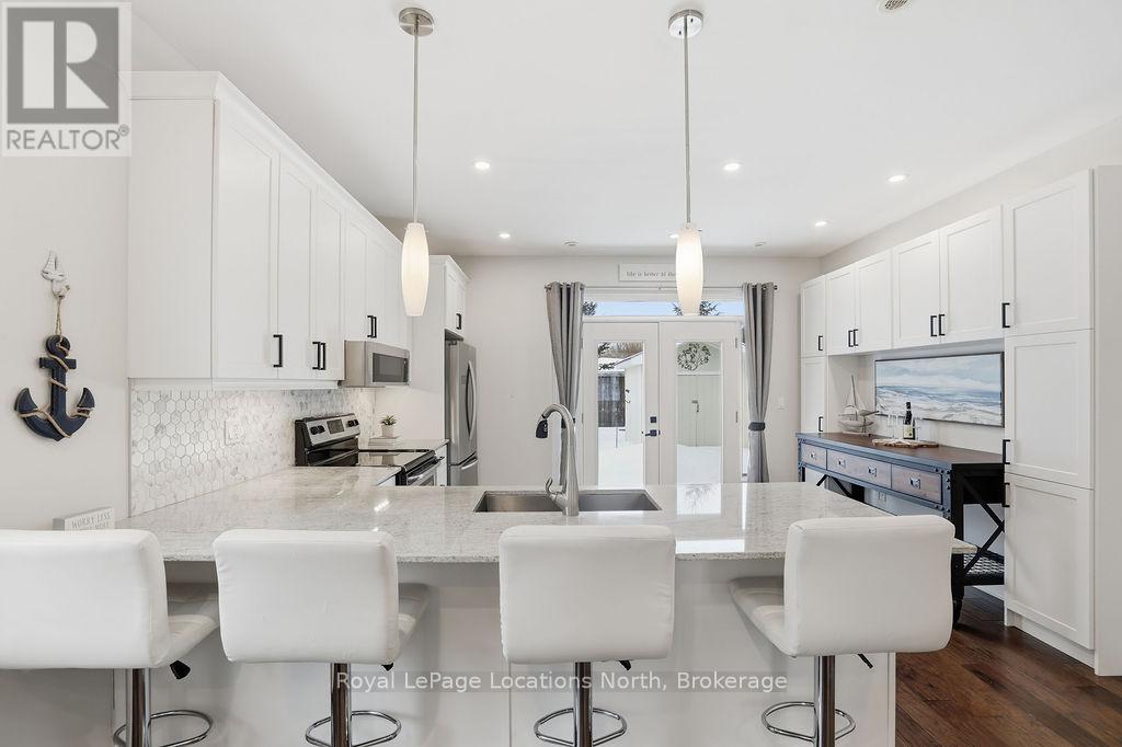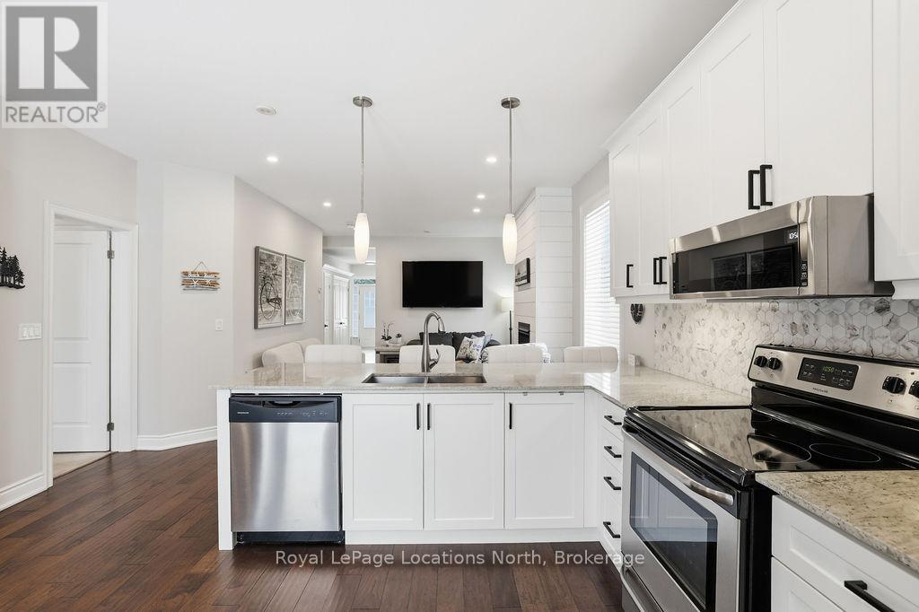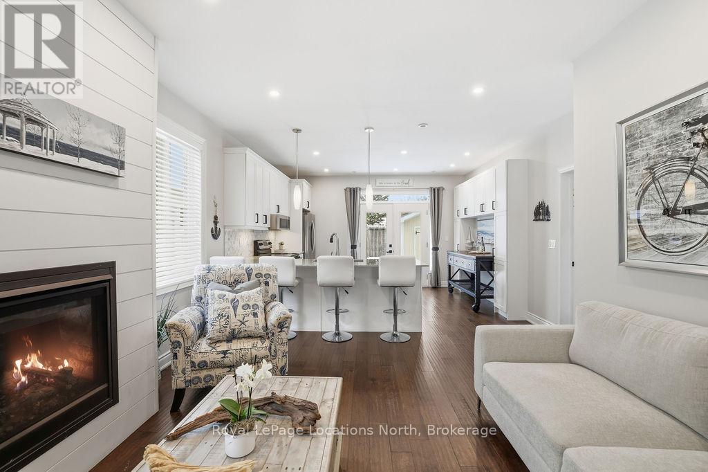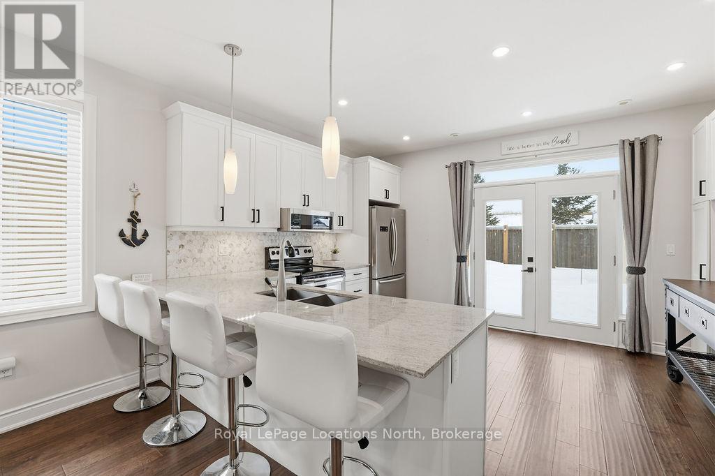 Beautifully finished True Ranch bungalow | Freehold semi-detached | No condo fees. Welcome to this beautifully finished True Ranch bungalow in the heart of Wasaga Beach, offering easy one-level living in a freehold semi-detached home with no condo fees. This 2-bedroom, 2-bathroom home features an attached garage with inside entry to a thoughtfully designed laundry room complete with a custom live-edge wood countertop, laundry sink, and extra cabinetry. Freshly painted in 2025, the home offers 9' ceilings, hardwood flooring, pot lights, custom blinds, and upgraded hardware on all doors and cabinets throughout. The spacious kitchen features ample cabinetry, a quartz breakfast bar, tiled backsplash, and stainless steel appliances, great for both everyday living and entertaining.The bright living area is filled with natural light and invites you to cozy up to the shiplapped gas fireplace on winter nights. French doors lead to a private, fully fenced backyard with a concrete patio, retractable awning for shade, and storage shed.The primary suite offers 11' vaulted ceilings, a walk-in closet, and a private ensuite with a glass shower. The guest bedroom is conveniently located near a full 4-piece bathroom with tub/shower combo, large vanity, and quartz countertops. Additional highlights include on-demand hot water, parking for two vehicles, and a quiet, well-kept neighbourhood. Just a short walk to the beach, restaurants, shopping, and the local community centre with an indoor walking track.An ideal option for first-time buyers, retirees or empty nesters, or a low-maintenance weekend getaway in Wasaga Beach. (id:4069)