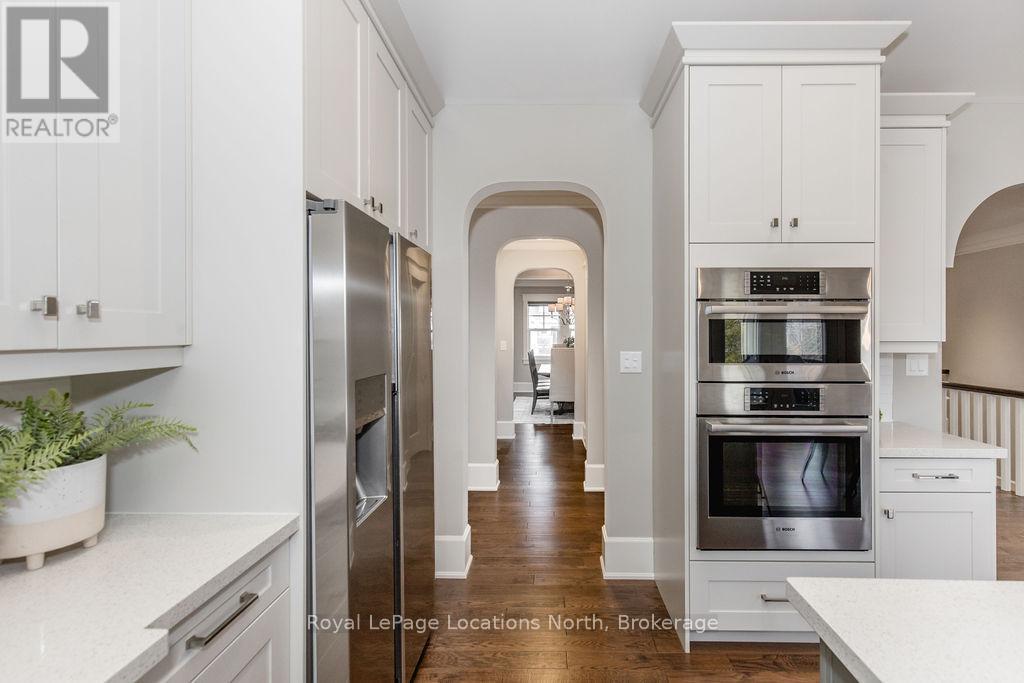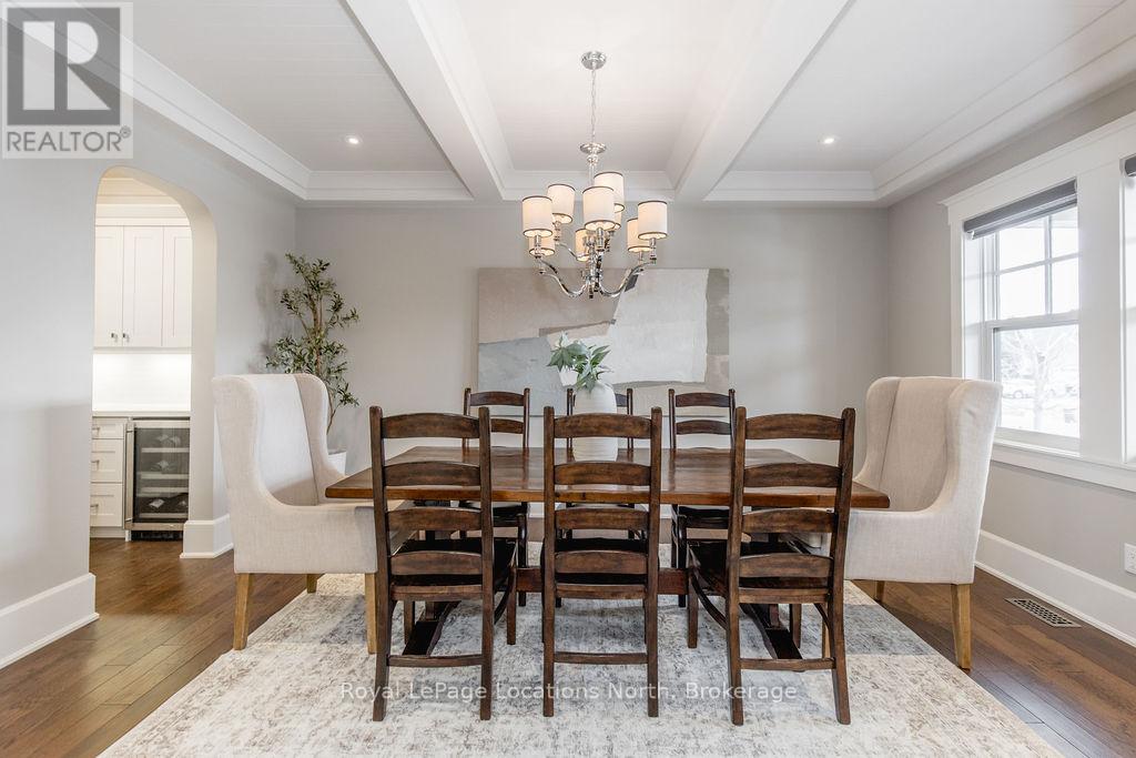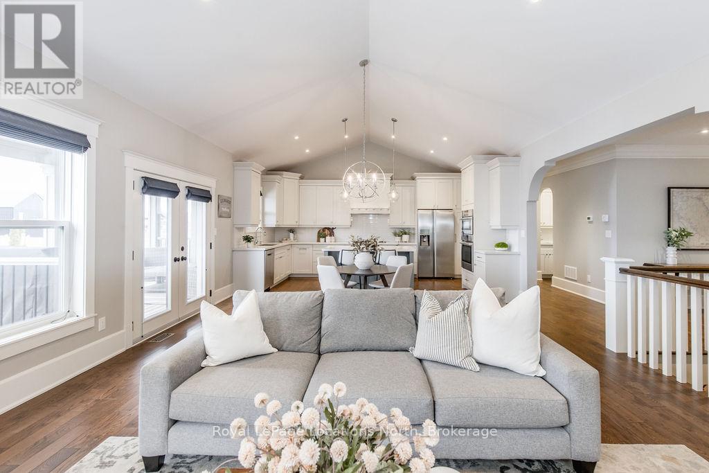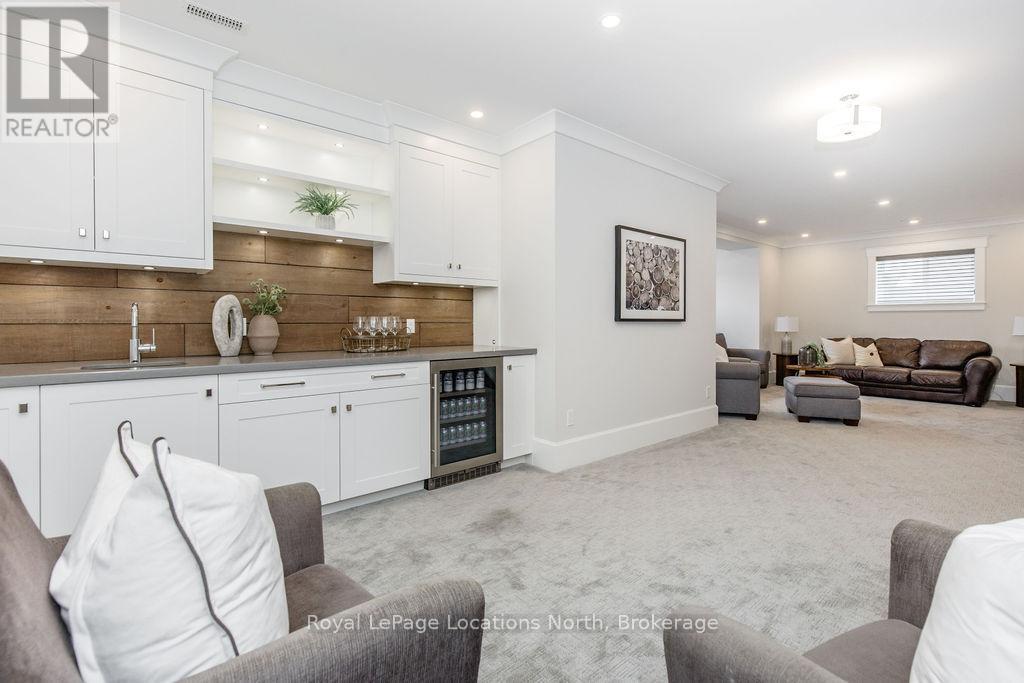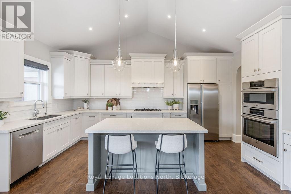 Located in a sought-after estate neighbourhood, this fully upgraded bungalow offers over 4,500 sq ft of finished living space with 3+2 bedrooms, a private 66 x 166 treed backyard & in-law suite potential. Mature trees have been brought in to create a rare, fully enclosed outdoor setting with exceptional privacy. Exterior features include a covered back porch, extended tiered deck, gas BBQ hookup, above-ground pool & a fully fenced yard. Large front porch with sun exposure.A grand front entry opens to a spacious foyer with walk-in closet, leading into a bright open-concept layout with vaulted ceilings & oversized windows. Rich hardwood, stunning crown mouldings including above windows, feature walls & oversized 9" baseboards carry throughout, complemented by upgraded hardware & refined finishes. The family room features a vaulted ceiling & gas fireplace, open to the kitchen and dining areas.The kitchen is designed for both function and entertaining with quartz countertops, an oversized island with seating, gas range, built-in double ovens, Samsung fridge, pendant lighting & pot lights. A butler's pantry with wine fridge and wet bar, along with a separate walk-in pantry, adds additional prep space & storage. Formal dining room offers a dedicated space for hosting. Main floor laundry with quartz counters & garage access. The lower level is finished to the same high standard, featuring 9 ft ceilings, extensive pot lighting, crown moulding, spray foam walls and headers & soundproofed construction with Roxul insulation. Includes 2 bedrooms, hidden playroom/workshop & a large entertainment area with custom bar, wet bar, & feature wall, ideal for games or hosting. A separate rec room provides flexibility for additional living space, sixth bedroom, gym, or future kitchen, with layout potential for a 2-bedroom in-law suite or multi-generational living. Amazing schools, offering french, catholic & public schools, plus close walk to the high school. (id:4069)