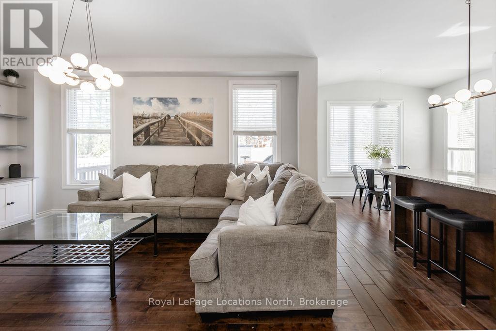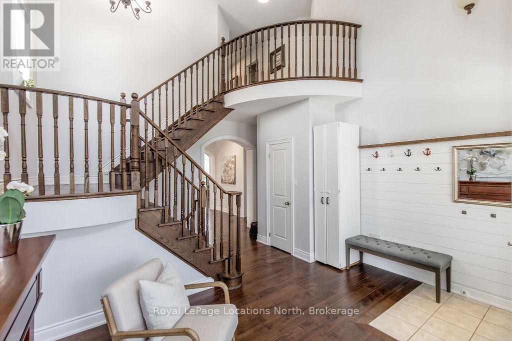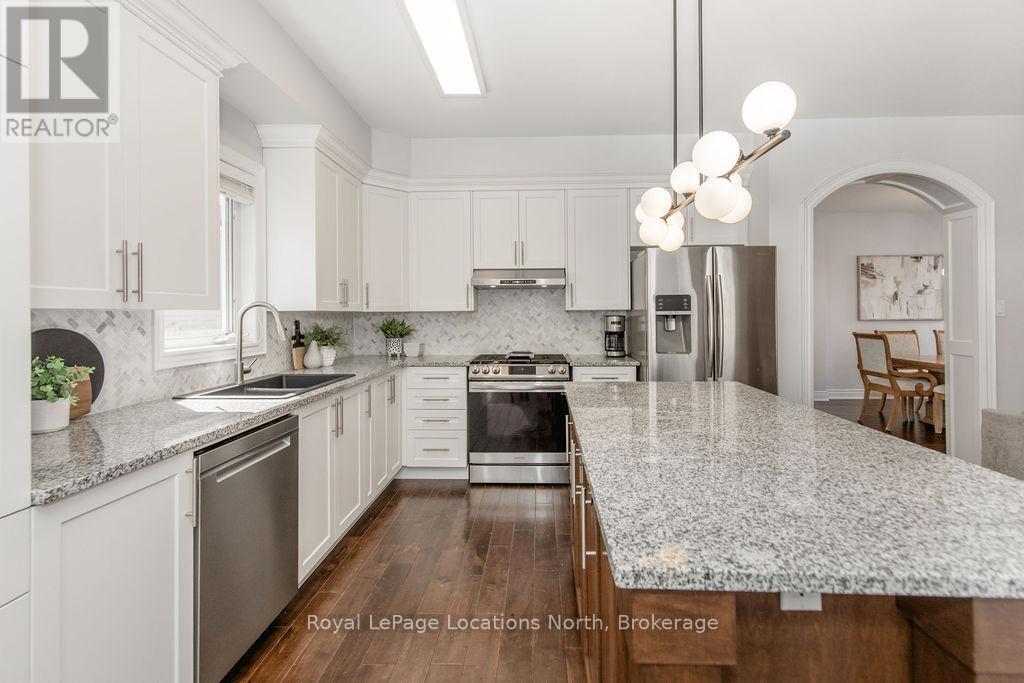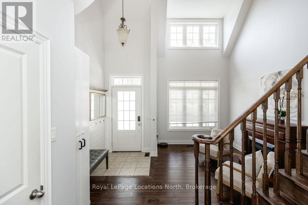 Welcome to this well-maintained 4 bedroom, 5 bathroom, 3,000+ sqft home located on a quiet cul-de-sac in a sought-after Wasaga Beach neighbourhood, just 5 minutes to the beach and Marlwood Golf Course, walking distance to the library, and upcoming K-12 School and community hub as well as easy access to Barrie. The main floor features a grand 18-ft ceiling entry with a sitting area and staircase to the upper balcony, a formal dining room, and an open concept living room and kitchen. The kitchen offers granite countertops, updated cabinet doors, a new gas stove and hood, and a great sized island perfect for hosting with plenty of space for cooking and baking. Engineered hardwood flooring runs throughout the main level, complemented by upgraded baseboards, upgraded mouldings, and fresh paint (2022), giving the home an upscale feel. Inside entry to a double car garage and a convenient powder room complete this level.Upstairs offers 3 large bedrooms, including an oversized primary suite with walk-in closet and ensuite featuring a glass shower, double sinks, and a soaker tub. A second bedroom also includes its own ensuite and walk-in closet, plus an additional 4-piece bathroom. With spacious bedrooms and two ensuites, this is a rare find for growing families.The finished basement adds a 4th bedroom, full bathroom with walk-in shower, and the perfect cozy rec room or man cave, also ideal as a theatre room. An unfinished area with plumbing rough-in offers potential for a kitchenette or in-law suite. Major updates include furnace (2023) and A/C (2023) with transferable 10-year parts and labour warranty. Additional features include 200 amp service, wired security system, gas BBQ line, garage door openers, and a fully fenced oversized yard. (id:4069)